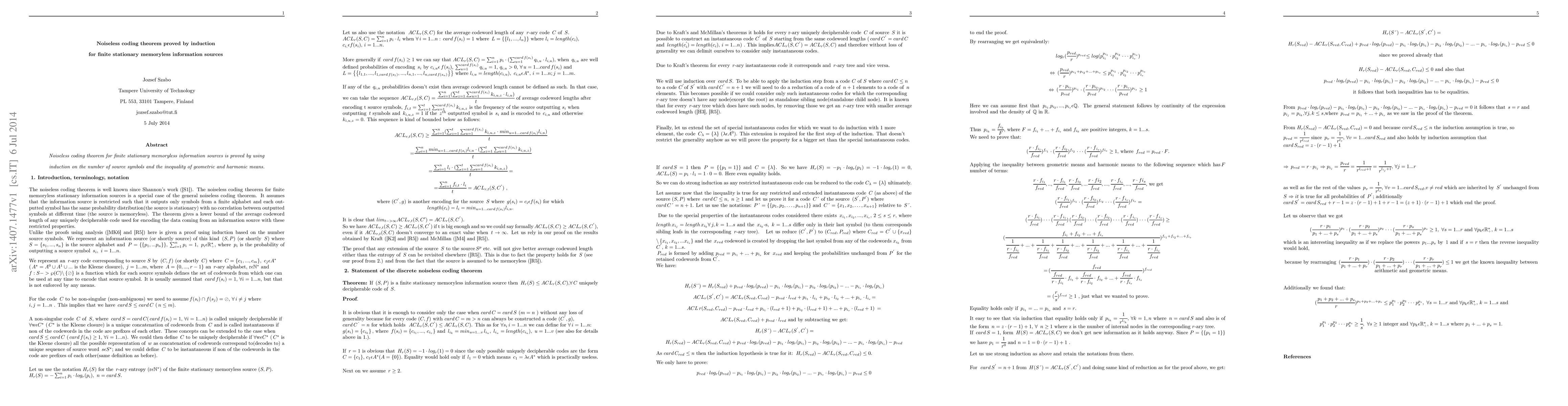 This paper presents an innovative proof of the Noiseless Coding Theorem for finite stationary memoryless information sources, leveraging mathematical induction and the geometric-harmonic mean inequality, providing a fresh perspective on data compression principles.