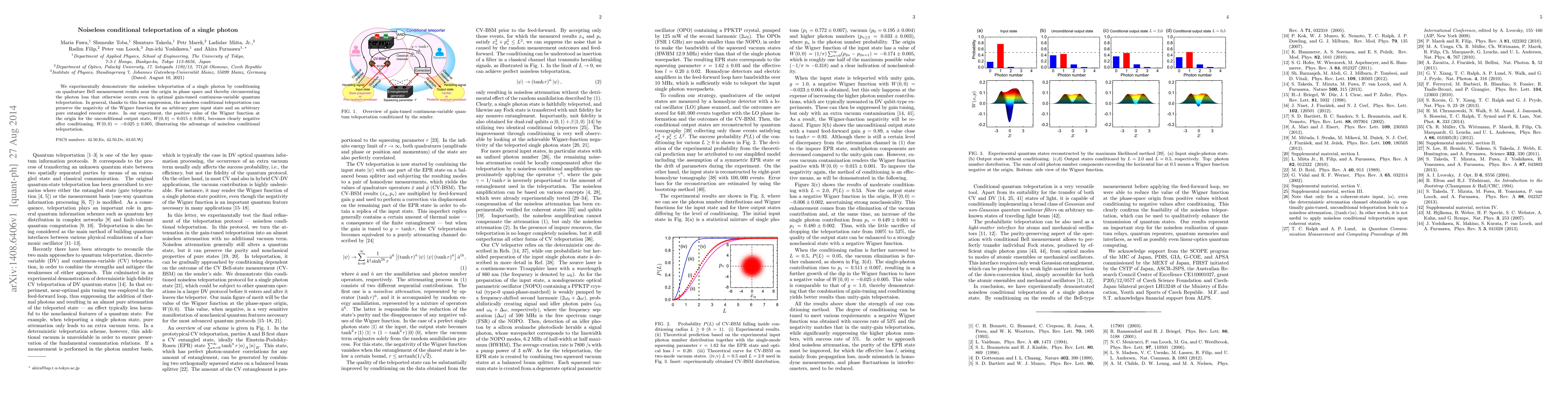 This paper demonstrates noiseless conditional teleportation of a single photon by using quadrature Bell measurements, which effectively suppresses photon loss and preserves the negativity of the Wigner function. The experiment shows a transition from a positive to a negative Wigner function value at the origin, highlighting the method's effectiveness.