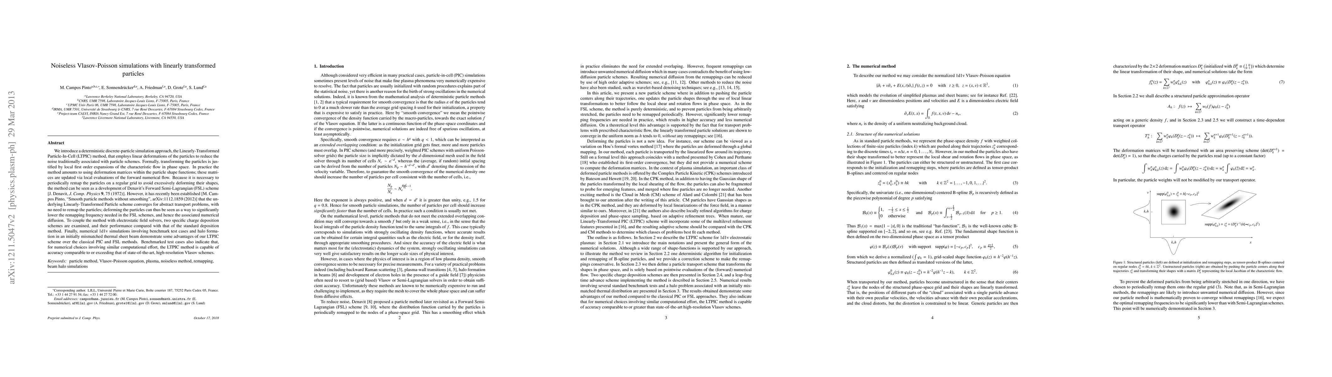 We introduce a deterministic discrete-particle simulation approach, the Linearly-Transformed Particle-In-Cell (LTPIC) method, that employs linear deformations of the particles to reduce the noise traditionally associated with particle schemes. Formally, transforming the particles is justified by local first order expansions of the characteristic flow in phase space. In practice the method amounts to using deformation matrices within the particle shape functions; these matrices are updated via local evaluations of the forward numerical flow. Because it is necessary to periodically remap the particles on a regular grid to avoid excessively deforming their shapes, the method can be seen as a development of Denavit's Forward Semi-Lagrangian (FSL) scheme [J. Denavit, J. Comp. Physics 9, 75 (1972)]. However, it has recently been established [M. Campos Pinto, "Smooth particle methods without smoothing", arXiv:1112.1859 (2012)] that the underlying Linearly-Transformed Particle scheme converges for abstract transport problems, with no need to remap the particles; deforming the particles can thus be seen as a way to significantly lower the remapping frequency needed in the FSL schemes, and hence the associated numerical diffusion. To couple the method with electrostatic field solvers, two specific charge deposition schemes are examined, and their performance compared with that of the standard deposition method. Finally, numerical 1d1v simulations involving benchmark test cases and halo formation in an initially mismatched thermal sheet beam demonstrate some advantages of our LTPIC scheme over the classical PIC and FSL methods. Benchmarked test cases also indicate that, for numerical choices involving similar computational effort, the LTPIC method is capable of accuracy comparable to or exceeding that of state-of-the-art, high-resolution Vlasov schemes.