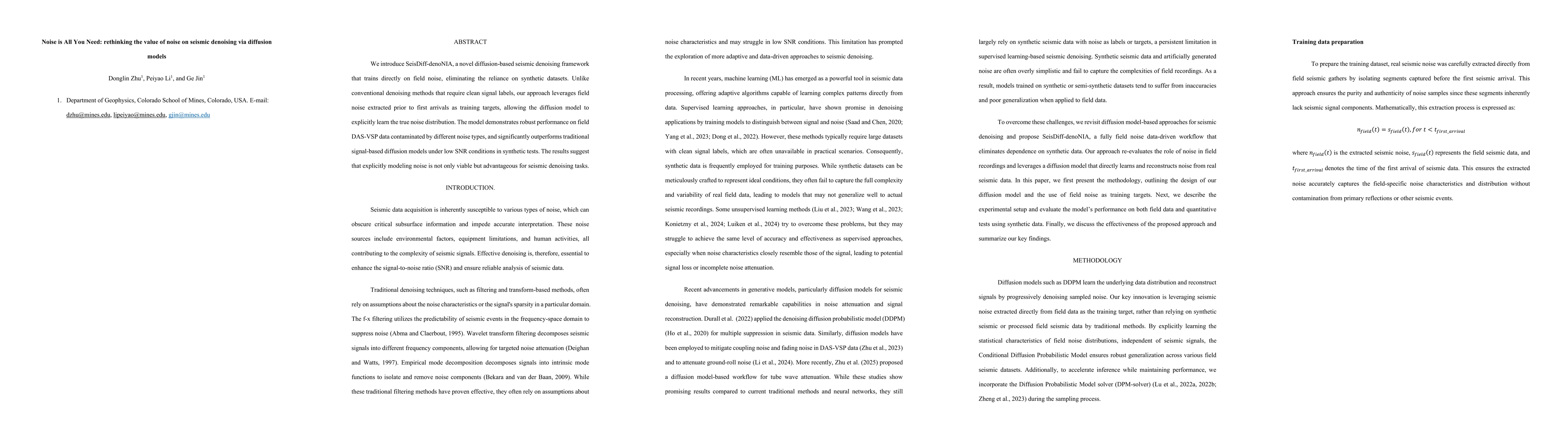 We introduce SeisDiff-denoNIA, a novel diffusion-based seismic denoising framework that trains directly on field noise, eliminating the reliance on synthetic datasets. Unlike conventional denoising methods that require clean signal labels, our approach leverages field noise extracted prior to first arrivals as training targets, allowing the diffusion model to explicitly learn the true noise distribution. The model demonstrates robust performance on field DAS-VSP data contaminated by different noise types, and significantly outperforms traditional signal-based diffusion models under low SNR conditions in synthetic tests. The results suggest that explicitly modeling noise is not only viable but advantageous for seismic denoising tasks.