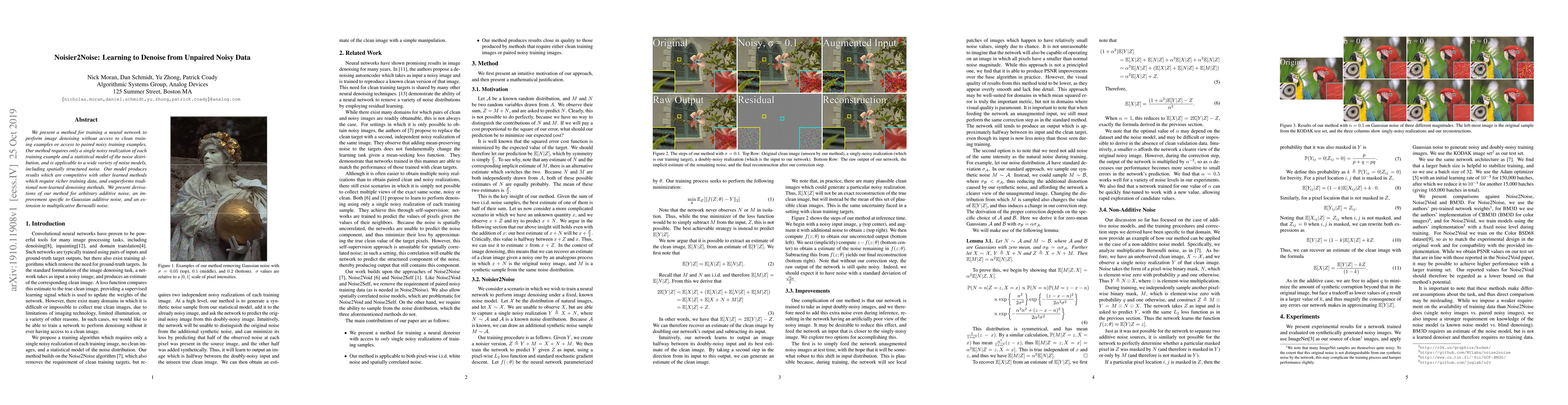 This paper introduces a method to train neural networks for image denoising without paired data, using only noisy images and statistical noise models. The approach produces competitive results with other methods requiring richer training data.