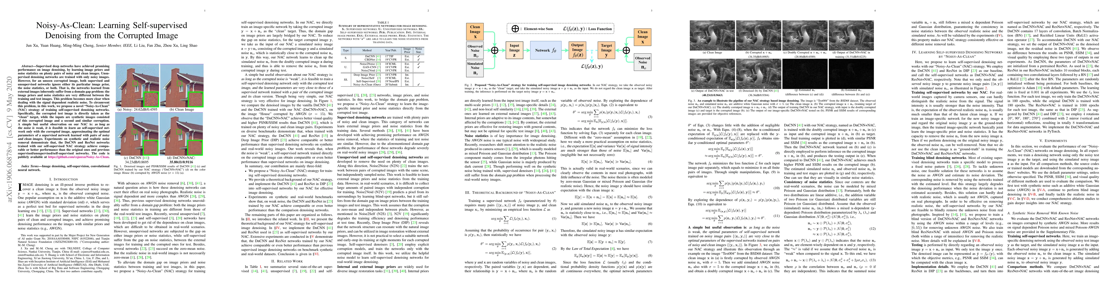 This paper proposes a "Noisy-As-Clean" (NAC) strategy for training self-supervised denoising networks that uses corrupted images as clean targets. The method trains networks effectively with only noisy inputs, achieving performance comparable to supervised networks that use pairs of noisy and clean images.