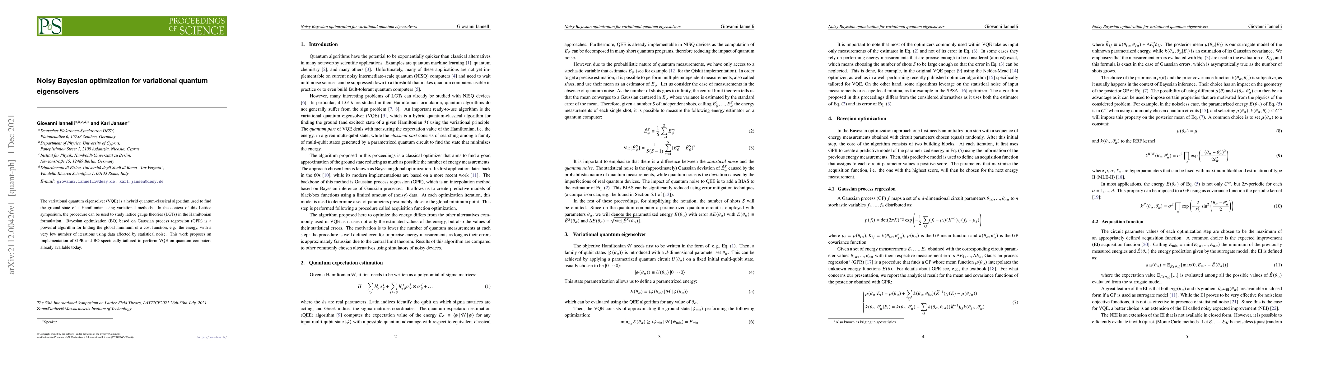 The variational quantum eigensolver (VQE) is a hybrid quantum-classical algorithm used to find the ground state of a Hamiltonian using variational methods. In the context of this Lattice symposium, the procedure can be used to study lattice gauge theories (LGTs) in the Hamiltonian formulation. Bayesian optimization (BO) based on Gaussian process regression (GPR) is a powerful algorithm for finding the global minimum of a cost function, e.g. the energy, with a very low number of iterations using data affected by statistical noise. This work proposes an implementation of GPR and BO specifically tailored to perform VQE on quantum computers already available today.