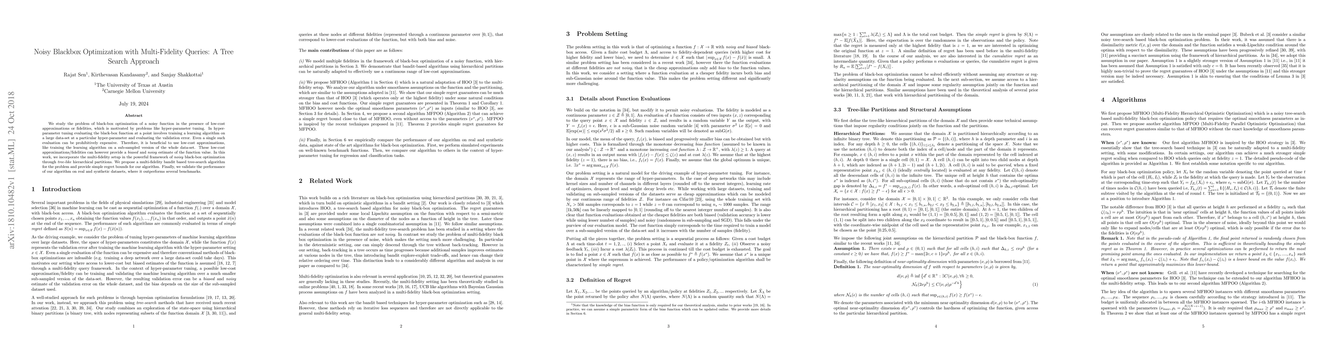 We study the problem of black-box optimization of a noisy function in the presence of low-cost approximations or fidelities, which is motivated by problems like hyper-parameter tuning. In hyper-parameter tuning evaluating the black-box function at a point involves training a learning algorithm on a large data-set at a particular hyper-parameter and evaluating the validation error. Even a single such evaluation can be prohibitively expensive. Therefore, it is beneficial to use low-cost approximations, like training the learning algorithm on a sub-sampled version of the whole data-set. These low-cost approximations/fidelities can however provide a biased and noisy estimate of the function value. In this work, we incorporate the multi-fidelity setup in the powerful framework of noisy black-box optimization through tree-like hierarchical partitions. We propose a multi-fidelity bandit based tree-search algorithm for the problem and provide simple regret bounds for our algorithm. Finally, we validate the performance of our algorithm on real and synthetic datasets, where it outperforms several benchmarks.