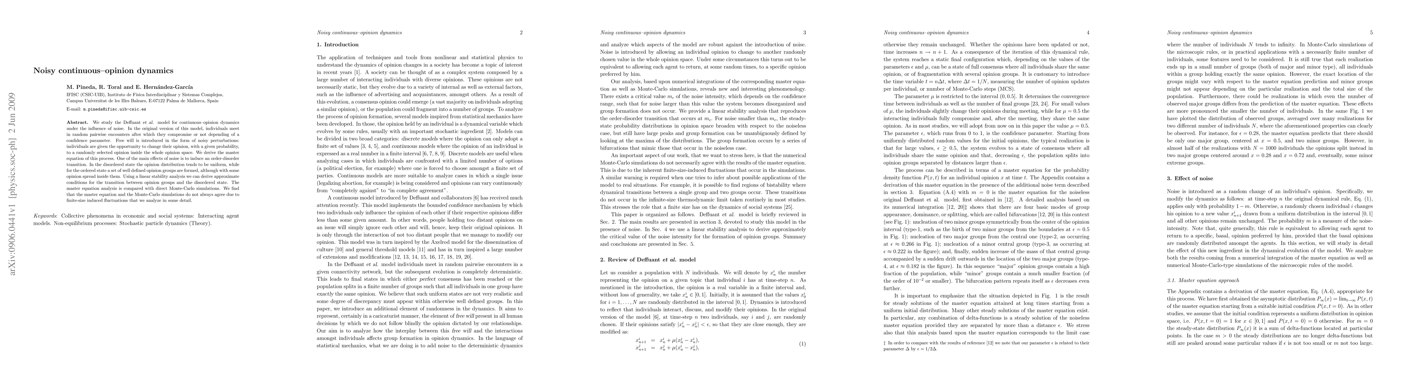 This paper investigates the Deffuant model for continuous opinion dynamics with added noise, deriving a master equation and analyzing its effects. Noise induces an order-disorder transition, with uniform opinion distribution in the disordered state and distinct opinion groups in the ordered state, identified through linear stability analysis. Discrepancies between the master equation and Monte-Carlo simulations are attributed to finite-size effects.
