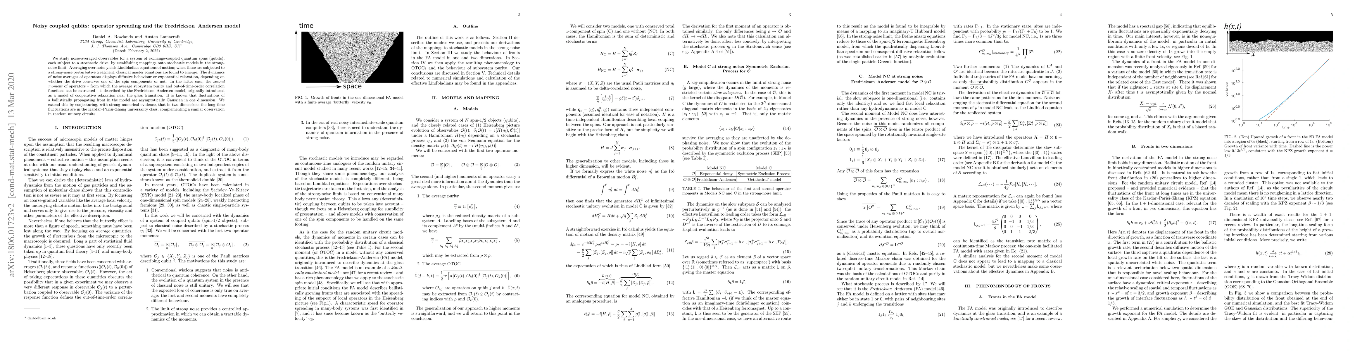 We study noise-averaged observables for a system of exchange-coupled quantum spins (qubits), each subject to a stochastic drive, by establishing mappings onto stochastic models in the strong-noise limit. Averaging over noise yields Lindbladian equations of motion; when these are subjected to a strong-noise perturbative treatment, classical master equations are found to emerge. The dynamics of noise averages of operators displays diffusive behaviour or exponential relaxation, depending on whether the drive conserves one of the spin components or not. In the latter case, the second moment of operators -- from which the average subsystem purity and out-of-time-order correlation functions can be extracted -- is described by the Fredrickson-Andersen model, originally introduced as a model of cooperative relaxation near the glass transition. It is known that fluctuations of a ballistically propagating front in the model are asymptotically Gaussian in one dimension. We extend this by conjecturing, with strong numerical evidence, that in two dimensions the long-time fluctuations are in the Kardar-Parisi-Zhang universality class, complementing a similar observation in random unitary circuits.