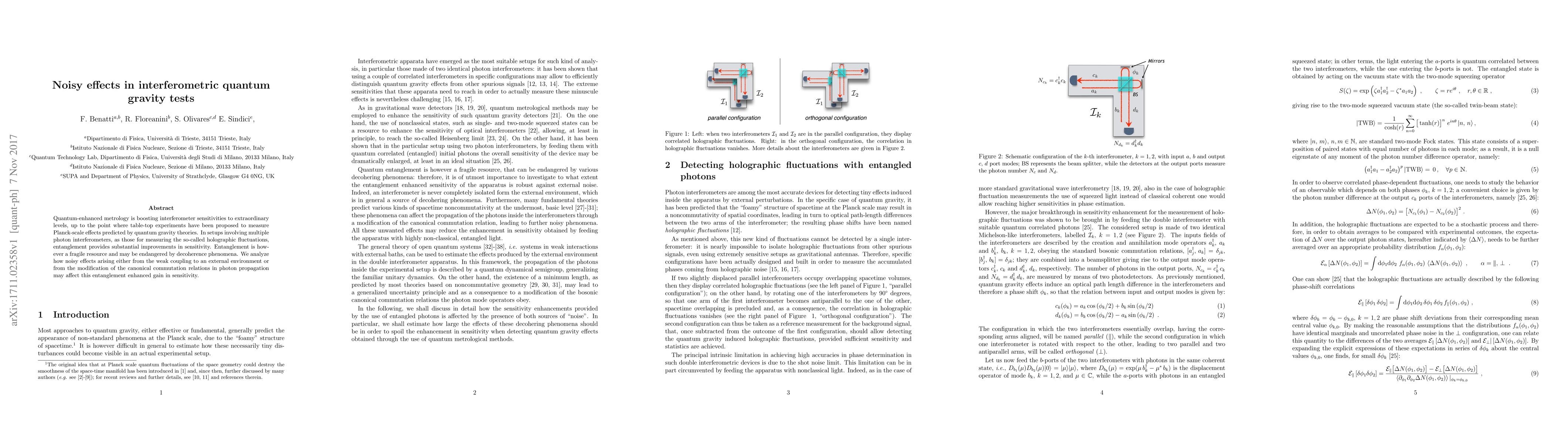 Quantum-enhanced metrology is boosting interferometer sensitivities to extraordinary levels, up to the point where table-top experiments have been proposed to measure Planck-scale effects predicted by quantum gravity theories. In setups involving multiple photon interferometers, as those for measuring the so-called holographic fluctuations, entanglement provides substantial improvements in sensitivity. Entanglement is however a fragile resource and may be endangered by decoherence phenomena. We analyze how noisy effects arising either from the weak coupling to an external environment or from the modification of the canonical commutation relations in photon propagation may affect this entanglement enhanced gain in sensitivity.