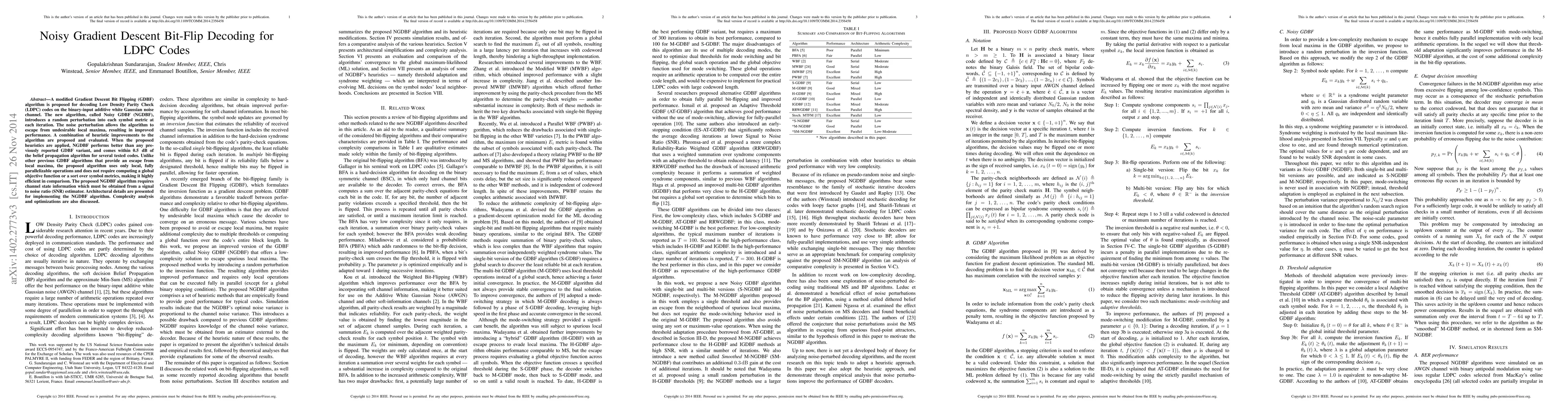 The paper proposes a Noisy Gradient Descent Bit-Flip Decoding (NGDBF) algorithm for decoding LDPC codes, improving upon traditional GDBF by introducing random perturbations to escape local maxima. The NGDBF algorithm, which uses local operations and avoids global computations, achieves performance close to belief propagation while being highly efficient.