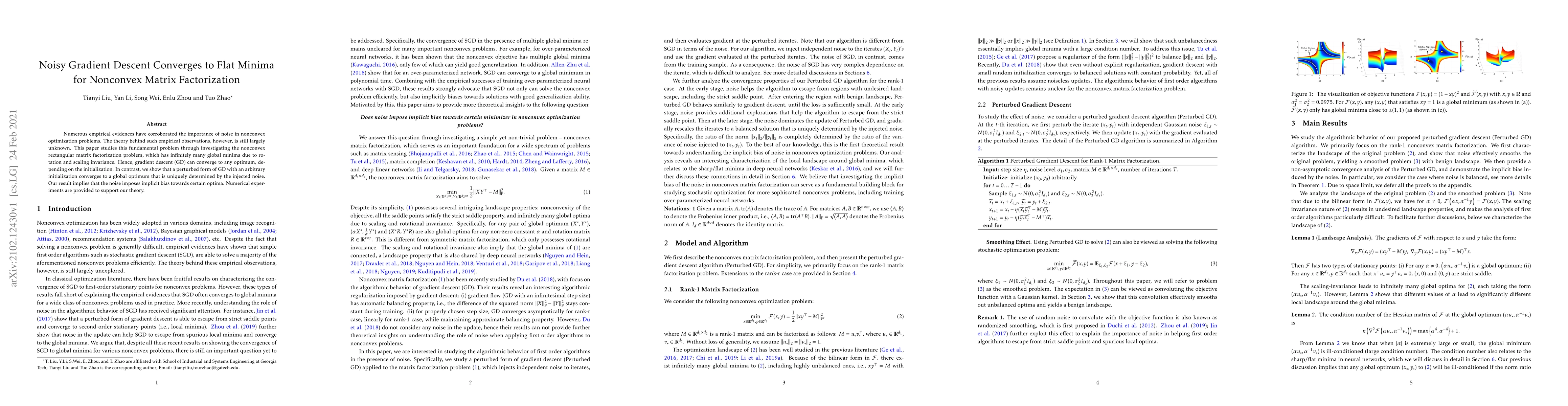 This paper demonstrates that noisy gradient descent converges to a uniquely determined flat minimum in nonconvex matrix factorization, implying that noise introduces implicit bias towards specific optima. Numerical experiments support the theoretical findings.
