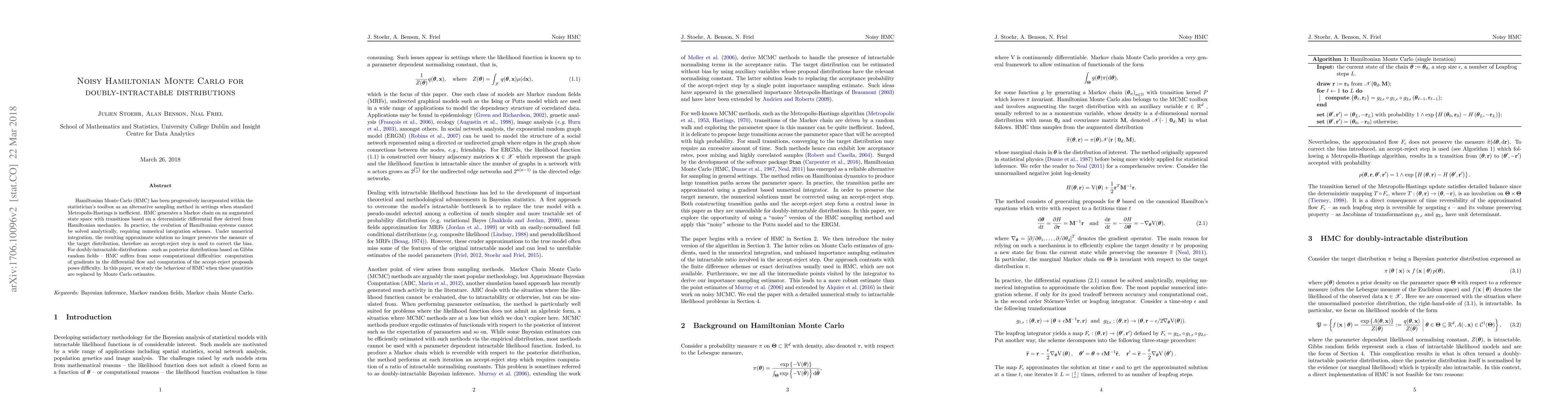 This paper investigates the application of Noisy Hamiltonian Monte Carlo (HMC) to doubly-intractable distributions, where traditional HMC struggles due to computational challenges in gradient computation and accept-reject proposals. It proposes replacing these quantities with Monte Carlo estimates to mitigate these issues.