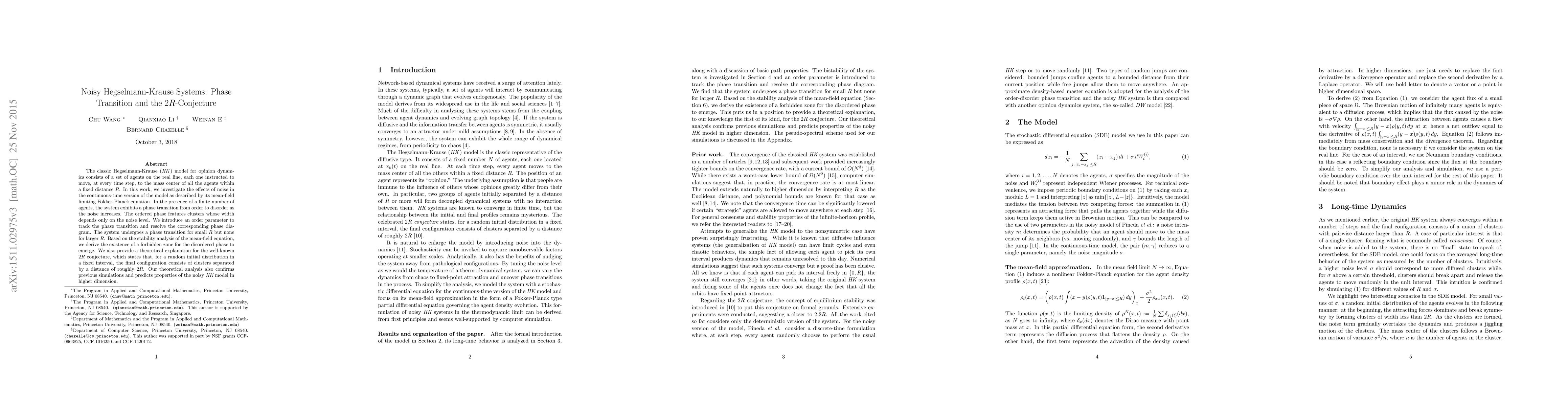 The classic Hegselmann-Krause (HK) model for opinion dynam- ics consists of a set of agents on the real line, each one instructed to move, at every time step, to the mass center of all the agents within a fixed distance R. In this work, we investigate the effects of noise in the continuous-time version of the model as described by its mean-field limiting Fokker-Planck equation. In the presence of a finite number of agents, the system exhibits a phase transition from order to disorder as the noise increases. The ordered phase features clusters whose width depends only on the noise level. We introduce an order parameter to track the phase transition and resolve the corresponding phase dia- gram. The system undergoes a phase transition for small R but none for larger R. Based on the stability analysis of the mean-field equation, we derive the existence of a forbidden zone for the disordered phase to emerge. We also provide a theoretical explanation for the well-known 2R conjecture, which states that, for a random initial distribution in a fixed interval, the final configuration consists of clusters separated by a distance of roughly 2R. Our theoretical analysis also confirms previous simulations and predicts properties of the noisy HK model in higher dimension.