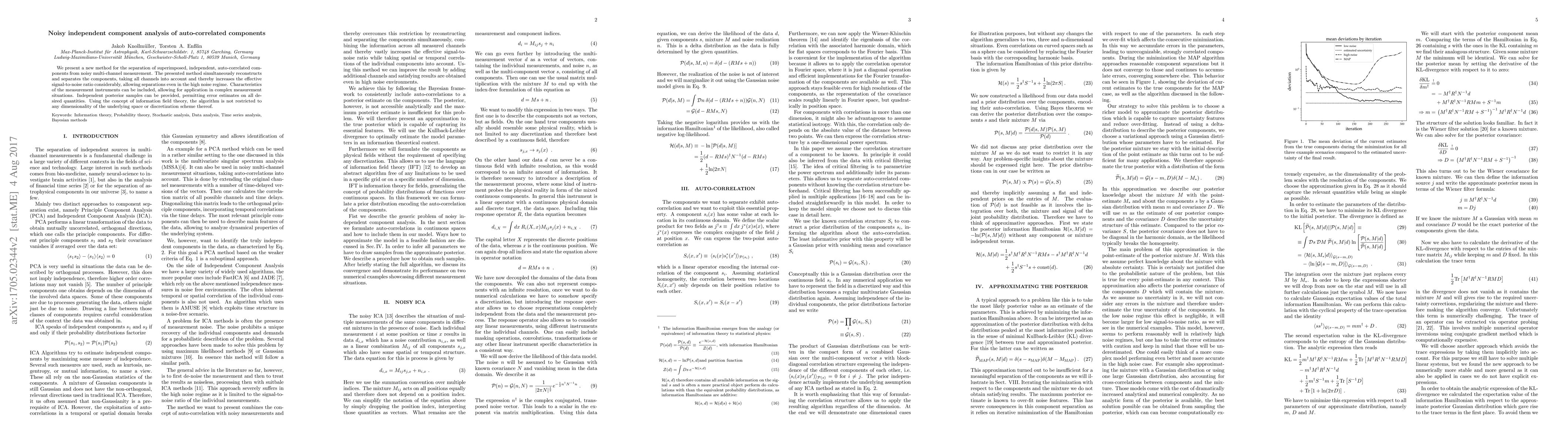 We present a new method for the separation of superimposed, independent, auto-correlated components from noisy multi-channel measurement. The presented method simultaneously reconstructs and separates the components, taking all channels into account and thereby increases the effective signal-to-noise ratio considerably, allowing separations even in the high noise regime. Characteristics of the measurement instruments can be included, allowing for application in complex measurement situations. Independent posterior samples can be provided, permitting error estimates on all desired quantities. Using the concept of information field theory, the algorithm is not restricted to any dimensionality of the underlying space or discretization scheme thereof.