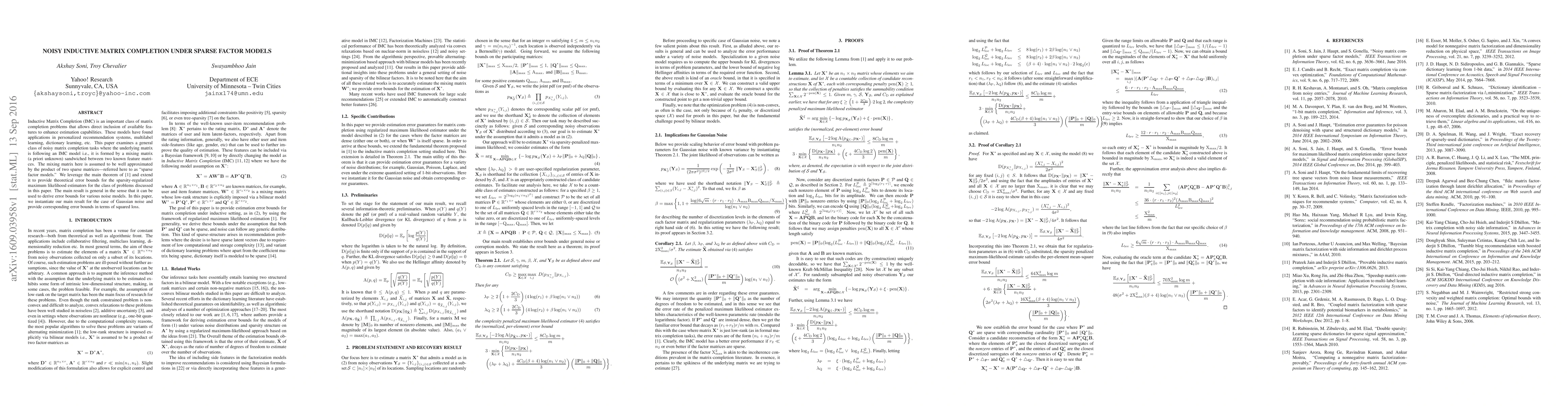 This paper investigates noisy Inductive Matrix Completion under sparse factor models, leveraging theoretical results to provide error bounds for sparsity-regularized maximum likelihood estimators. It applies these bounds specifically to Gaussian noise scenarios, offering insights into estimation capabilities in recommendation systems and related applications.