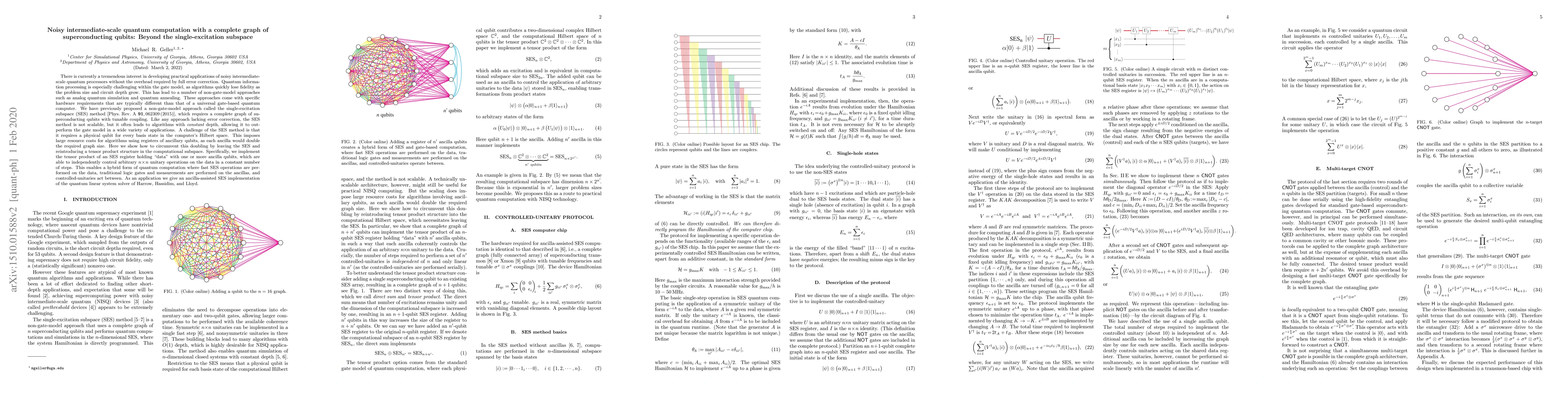 There is currently a tremendous interest in developing practical applications of NISQ processors without the overhead required by full error correction. Quantum information processing is especially challenging within the gate model, as algorithms quickly lose fidelity as the problem size and circuit depth grow. This has lead to a number of non-gate-model approaches such as analog quantum simulation and quantum annealing. These approaches come with specific hardware requirements that are typically different than that of a universal gate-based quantum computer. We have previously proposed a non-gate-model approach called the single-excitation subspace (SES) method, which requires a complete graph of superconducting qubits. Like any approach lacking error correction, the SES method is not scalable, but it often leads to algorithms with constant depth, allowing it to outperform the gate model in a wide variety of applications. A challenge of the SES method is that it requires a physical qubit for every basis state in the computer's Hilbert space. This imposes large resource costs for algorithms using registers of ancillary qubits, as each ancilla would double the required graph size. Here we show how to circumvent this doubling by leaving the SES and reintroducing a tensor product structure in the computational subspace. Specifically, we implement the tensor product of an SES register holding ``data" with one or more ancilla qubits. This enables a hybrid form of quantum computation where fast SES operations are performed on the data, traditional logic gates and measurements are performed on the ancillas, and controlled-unitaries act between. As an application we give an SES implementation of the quantum linear system solver of Harrow, Hassidim, and Lloyd.