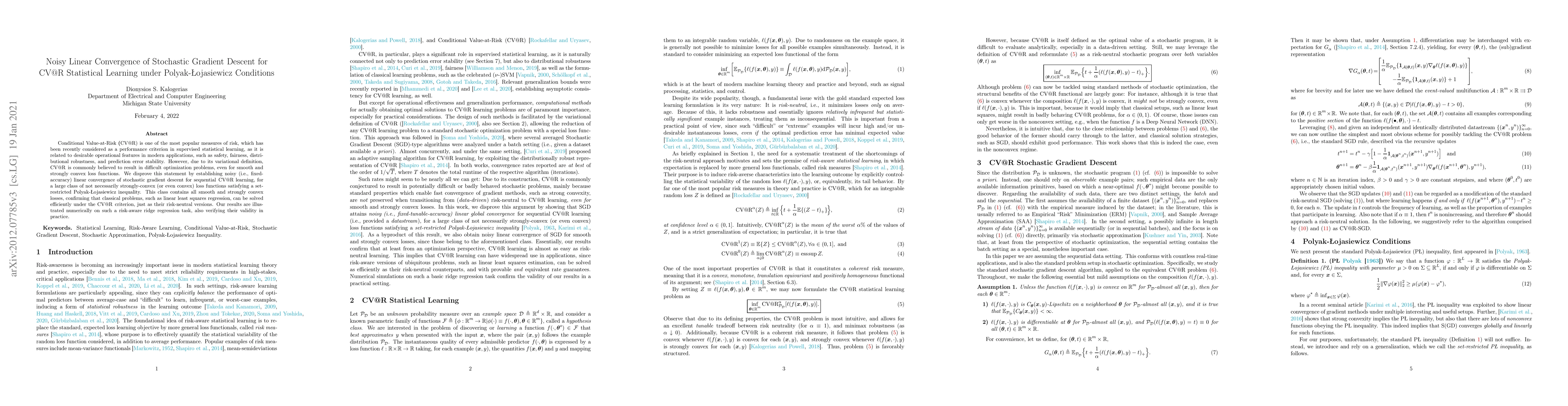 This paper demonstrates the noisy linear convergence of stochastic gradient descent for optimizing Conditional Value-at-Risk (CV@R) under Polyak-{\L}ojasiewicz conditions, showing that CV@R can efficiently solve classical problems like linear least squares regression, contrary to common belief. Numerical experiments on ridge regression validate the theoretical results.