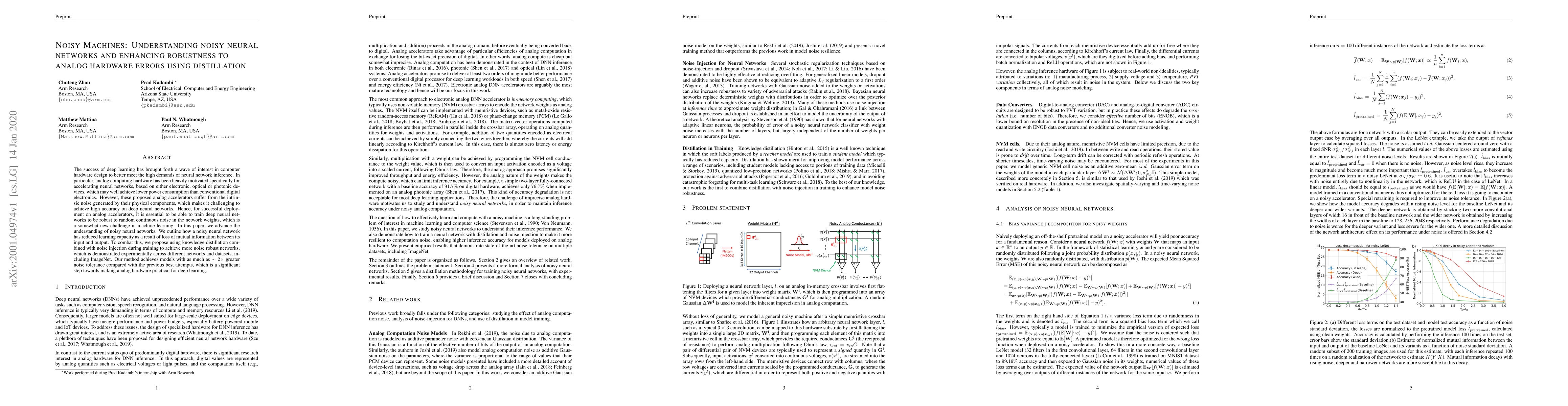 The success of deep learning has brought forth a wave of interest in computer hardware design to better meet the high demands of neural network inference. In particular, analog computing hardware has been heavily motivated specifically for accelerating neural networks, based on either electronic, optical or photonic devices, which may well achieve lower power consumption than conventional digital electronics. However, these proposed analog accelerators suffer from the intrinsic noise generated by their physical components, which makes it challenging to achieve high accuracy on deep neural networks. Hence, for successful deployment on analog accelerators, it is essential to be able to train deep neural networks to be robust to random continuous noise in the network weights, which is a somewhat new challenge in machine learning. In this paper, we advance the understanding of noisy neural networks. We outline how a noisy neural network has reduced learning capacity as a result of loss of mutual information between its input and output. To combat this, we propose using knowledge distillation combined with noise injection during training to achieve more noise robust networks, which is demonstrated experimentally across different networks and datasets, including ImageNet. Our method achieves models with as much as two times greater noise tolerance compared with the previous best attempts, which is a significant step towards making analog hardware practical for deep learning.