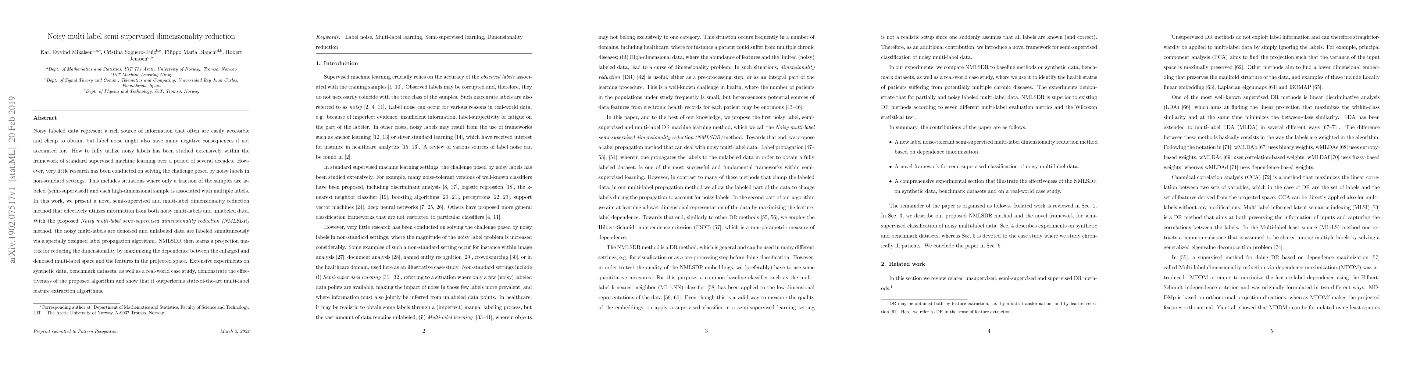 This paper introduces a novel semi-supervised and multi-label dimensionality reduction method called NMLSDR to handle noisy labels in high-dimensional data. The method denoises multi-labels and labels unlabeled data using a label propagation algorithm, then projects the data to a lower-dimensional space while maximizing label-feature dependence, outperforming existing algorithms in experiments.