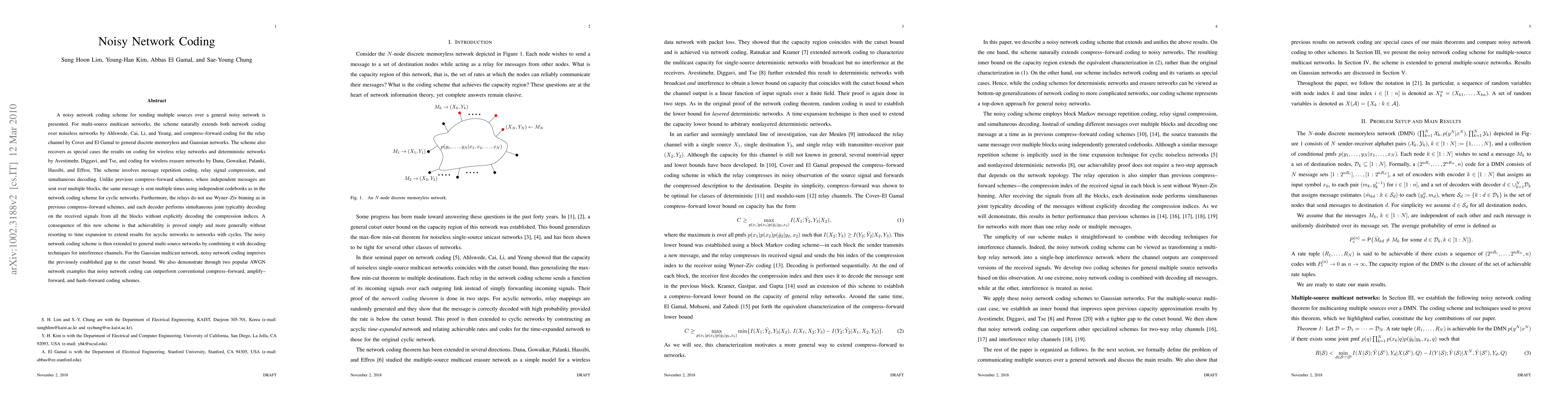 A noisy network coding scheme for sending multiple sources over a general noisy network is presented. For multi-source multicast networks, the scheme naturally extends both network coding over noiseless networks by Ahlswede, Cai, Li, and Yeung, and compress-forward coding for the relay channel by Cover and El Gamal to general discrete memoryless and Gaussian networks. The scheme also recovers as special cases the results on coding for wireless relay networks and deterministic networks by Avestimehr, Diggavi, and Tse, and coding for wireless erasure networks by Dana, Gowaikar, Palanki, Hassibi, and Effros. The scheme involves message repetition coding, relay signal compression, and simultaneous decoding. Unlike previous compress--forward schemes, where independent messages are sent over multiple blocks, the same message is sent multiple times using independent codebooks as in the network coding scheme for cyclic networks. Furthermore, the relays do not use Wyner--Ziv binning as in previous compress-forward schemes, and each decoder performs simultaneous joint typicality decoding on the received signals from all the blocks without explicitly decoding the compression indices. A consequence of this new scheme is that achievability is proved simply and more generally without resorting to time expansion to extend results for acyclic networks to networks with cycles. The noisy network coding scheme is then extended to general multi-source networks by combining it with decoding techniques for interference channels. For the Gaussian multicast network, noisy network coding improves the previously established gap to the cutset bound. We also demonstrate through two popular AWGN network examples that noisy network coding can outperform conventional compress-forward, amplify-forward, and hash-forward schemes.