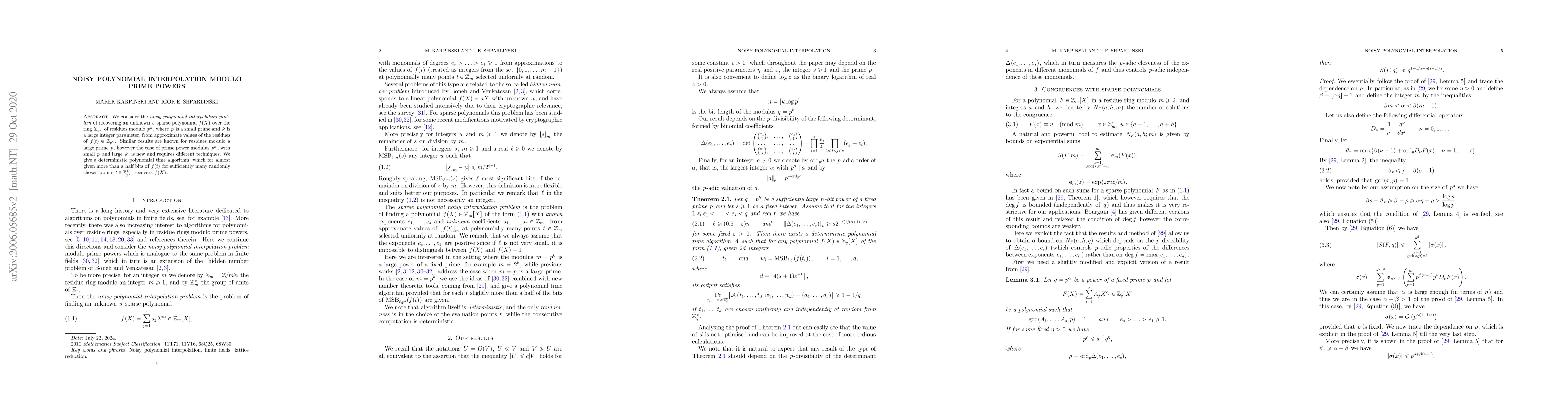 This paper presents a deterministic polynomial time algorithm for solving the noisy polynomial interpolation problem over the ring $\mathbb Z_{p^k}$, where $p$ is a small prime and $k$ is large. It addresses the novel case of prime power modulus $p^k$ and recovers an $s$-sparse polynomial from approximate values, given more than half the bits of $f(t)$ for many randomly chosen points.