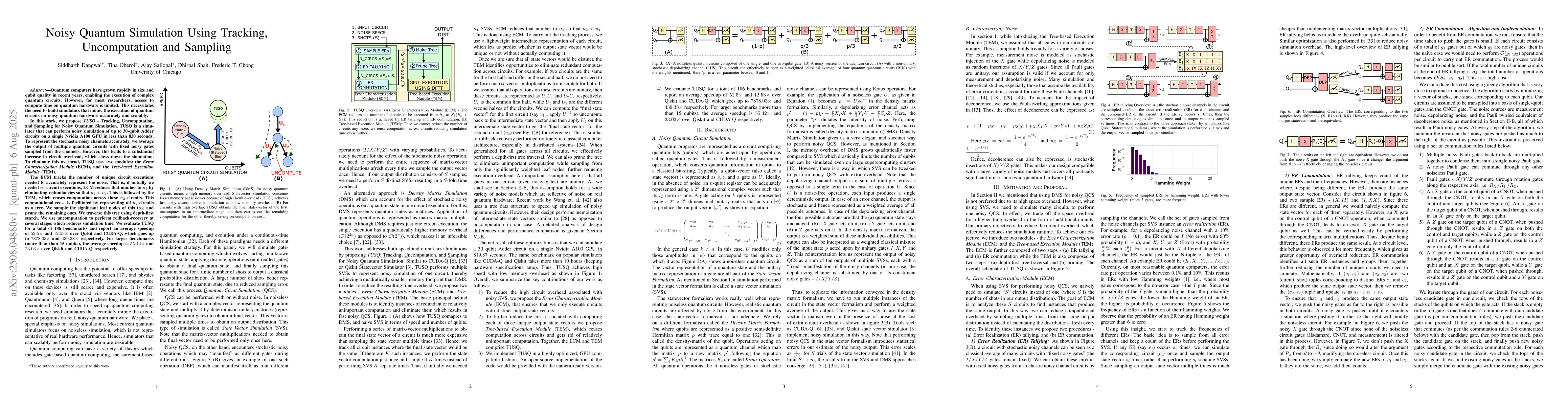 Quantum computers have grown in size and qubit quality in recent years, enabling the execution of complex quantum circuits. However, for most researchers, access to compute time on quantum hardware is limited. This necessitates the need to build simulators that mimic the execution of quantum circuits on noisy quantum hardware accurately and scalably. In this work, we propose TUSQ - Tracking, Uncomputation, and Sampling for Noisy Quantum Simulation. To represent the stochastic noisy channels accurately, we average the output of multiple quantum circuits with fixed noisy gates sampled from the channels. However, this leads to a substantial increase in circuit overhead, which slows down the simulation. To eliminate this overhead, TUSQ uses two modules: the Error Characterization Module (ECM), and the Tree-based Execution Module (TEM). The ECM tracks the number of unique circuit executions needed to accurately represent the noise. That is, if initially we needed $n_{1}$ circuit executions, ECM reduces that number to $n_{2}$ by eliminating redundancies so that $n_{2} < n_{1}$. This is followed by the TEM, which reuses computation across these $n_{2}$ circuits. This computational reuse is facilitated by representing all $n_{2}$ circuits as a tree. We sample the significant leaf nodes of this tree and prune the remaining ones. We traverse this tree using depth-first search. We use uncomputation to perform rollback-recovery at several stages which reduces simulation time. We evaluate TUSQ for a total of 186 benchmarks and report an average speedup of $52.5\times$ and $12.53\times$ over Qiskit and CUDA-Q, which goes up to $7878.03\times$ and $439.38\times$ respectively. For larger benchmarks (more than than 15 qubits), the average speedup is $55.42\times$ and $23.03\times$ over Qiskit and CUDA-Q respectively