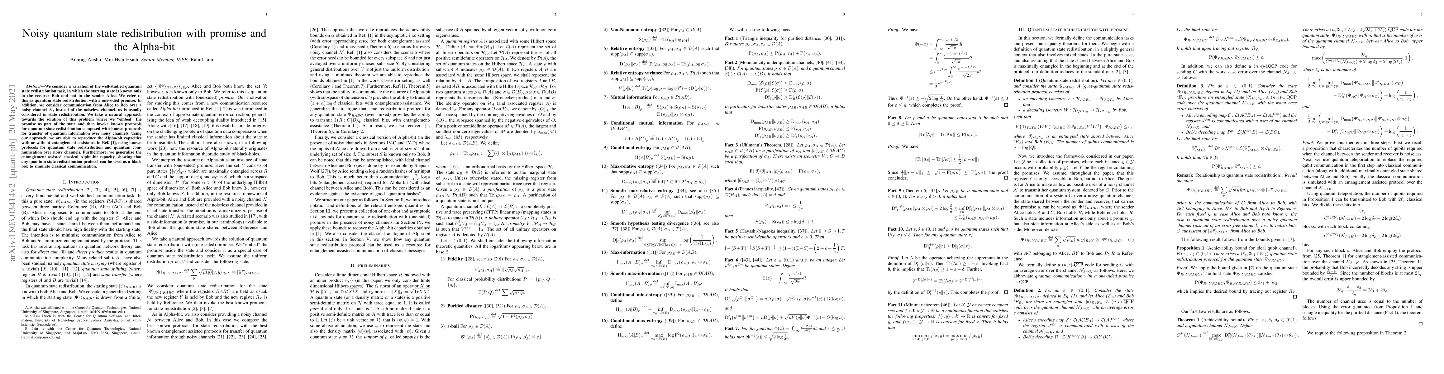 Researchers developed a method to enable quantum state redistribution with promise over noisy channels, reproducing Alpha-bit capacities without entanglement assistance. This approach also allows any quantum state redistribution protocol to be used as a black box for simulating classical communication.