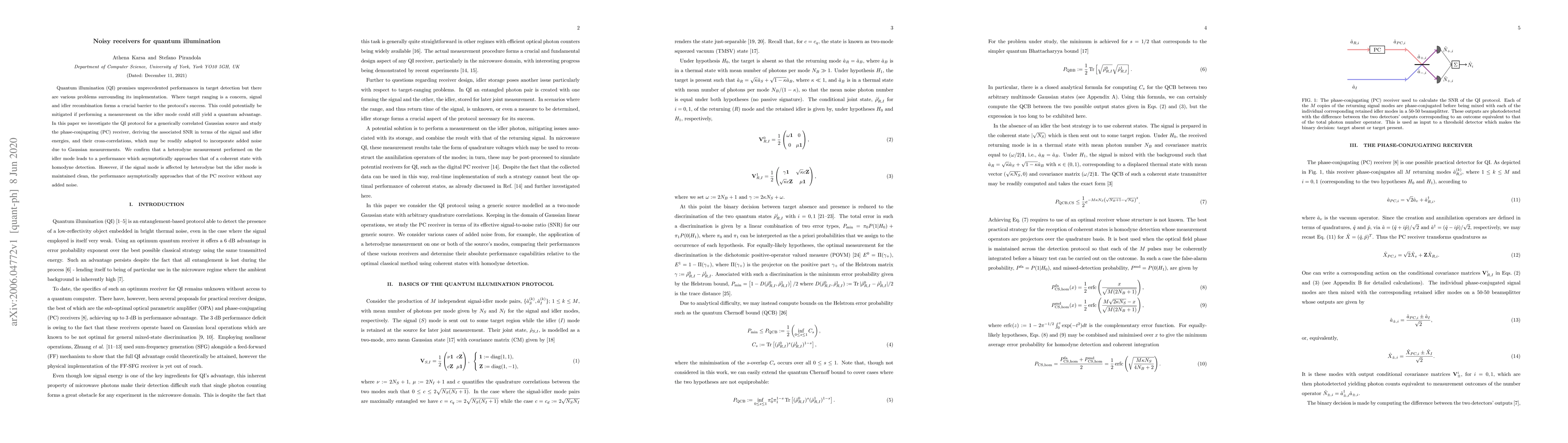 Researchers investigated quantum illumination with a phase-conjugating receiver to improve target detection performance. They found that measuring the idler mode can lead to better results, even when noisy signals affect the signal mode.