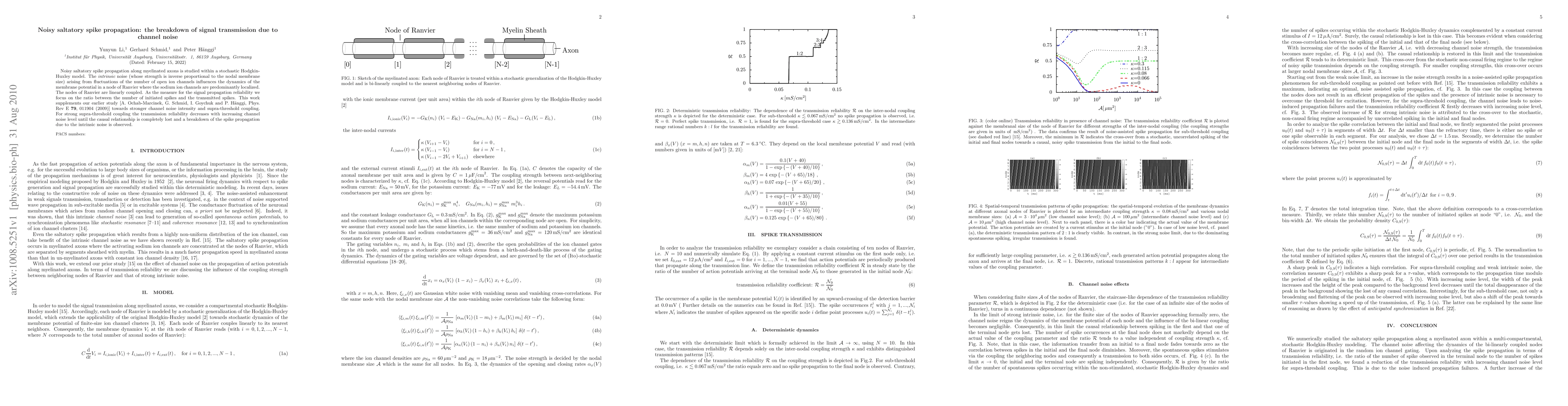 This paper investigates how intrinsic noise from ion channel fluctuations affects saltatory spike propagation in myelinated axons using a stochastic Hodgkin-Huxley model, finding that high channel noise levels can lead to a breakdown in signal transmission reliability. The study extends previous work by examining the effects of stronger channel noise and supra-threshold coupling on spike propagation.