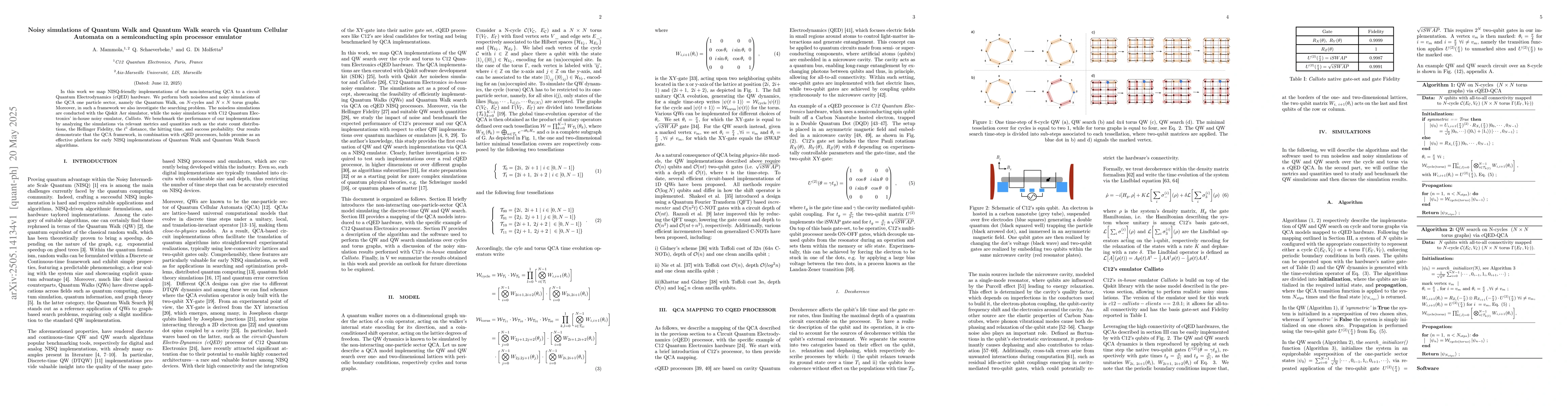 The paper presents a method for simulating Quantum Walk and Quantum Walk Search using QCA on cQED hardware, including noise modeling and performance benchmarking, contributing to the understanding of NISQ algorithm implementations.