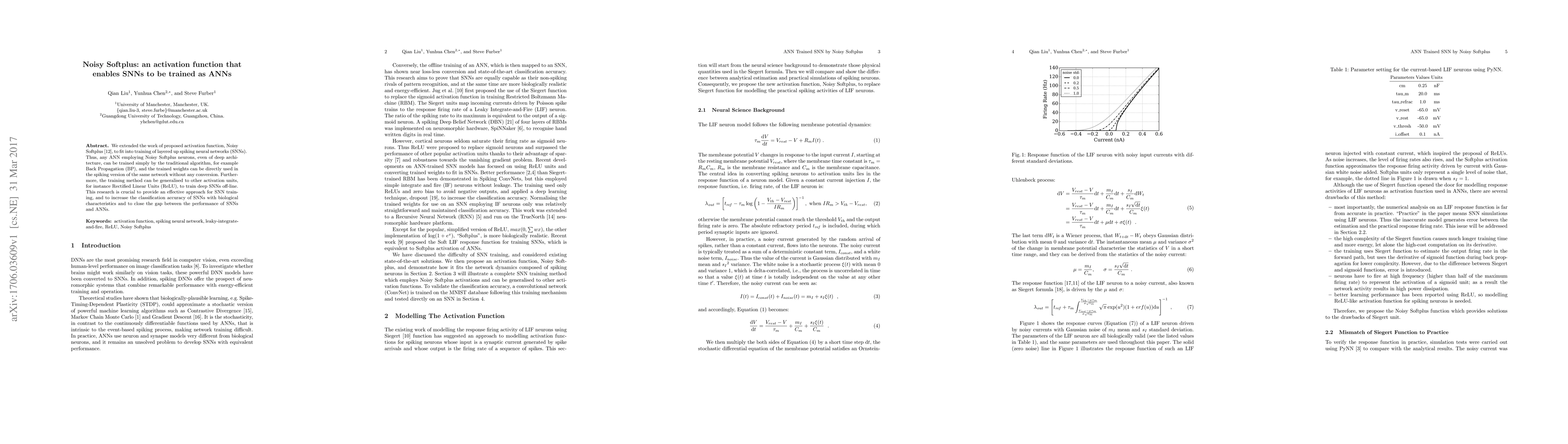 The research introduces the Noisy Softplus activation function, enabling traditional training algorithms like Back Propagation to train spiking neural networks (SNNs) as if they were artificial neural networks (ANNs). This approach allows trained weights from ANNs to be directly used in SNNs, enhancing classification accuracy and bridging the performance gap between SNNs and ANNs.