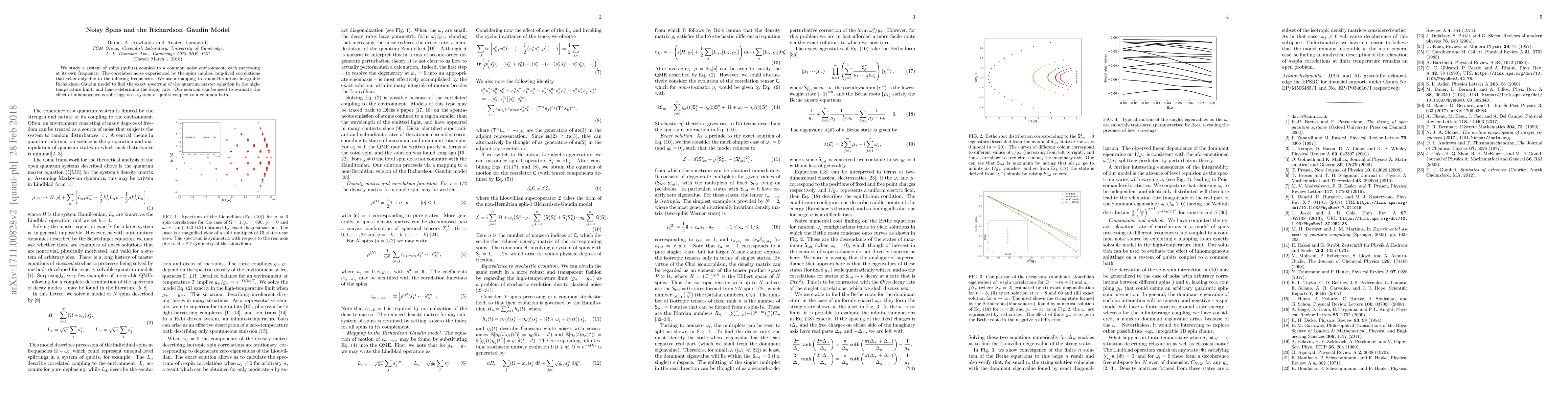 The paper introduces a novel approach to solve the quantum master equation for noisy spin systems by mapping it to a non-Hermitian Richardson-Gaudin model, yielding exact solutions in the high-temperature limit.