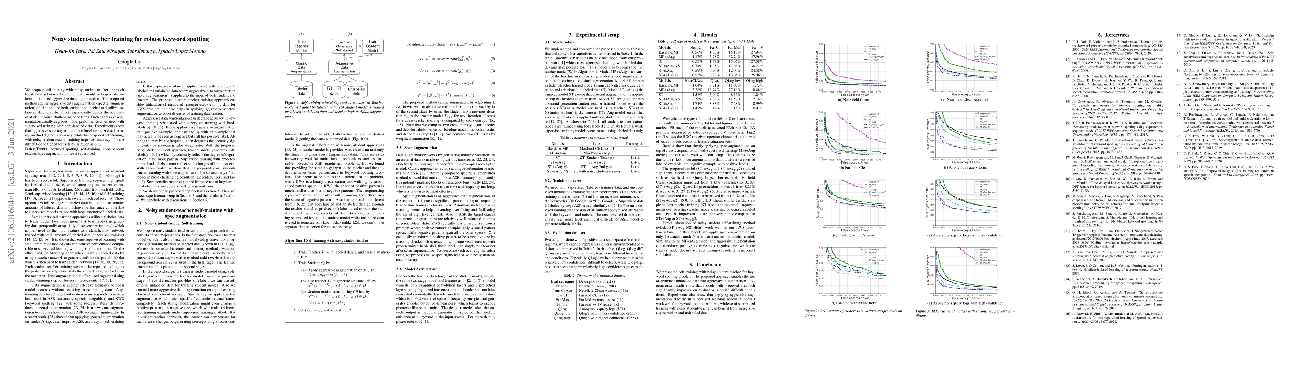 We propose self-training with noisy student-teacher approach for streaming keyword spotting, that can utilize large-scale unlabeled data and aggressive data augmentation. The proposed method applies aggressive data augmentation (spectral augmentation) on the input of both student and teacher and utilize unlabeled data at scale, which significantly boosts the accuracy of student against challenging conditions. Such aggressive augmentation usually degrades model performance when used with supervised training with hard-labeled data. Experiments show that aggressive spec augmentation on baseline supervised training method degrades accuracy, while the proposed self-training with noisy student-teacher training improves accuracy of some difficult-conditioned test sets by as much as 60%.