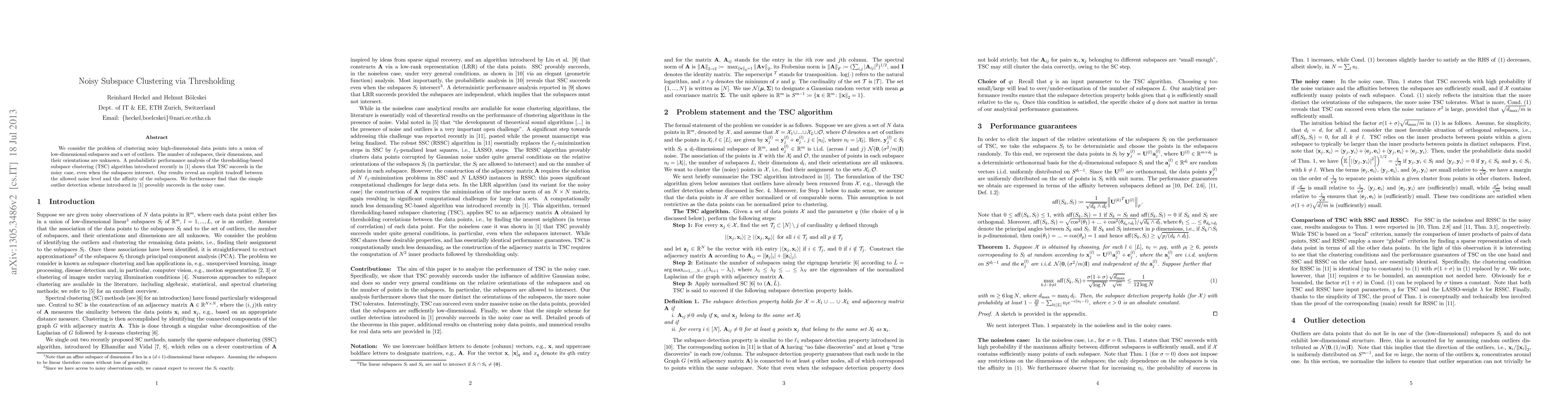 This paper investigates clustering noisy high-dimensional data into low-dimensional subspaces using a thresholding-based subspace clustering (TSC) algorithm. The analysis reveals a tradeoff between noise tolerance and subspace affinity, demonstrating the TSC algorithm's success even with intersecting subspaces and noisy outliers.