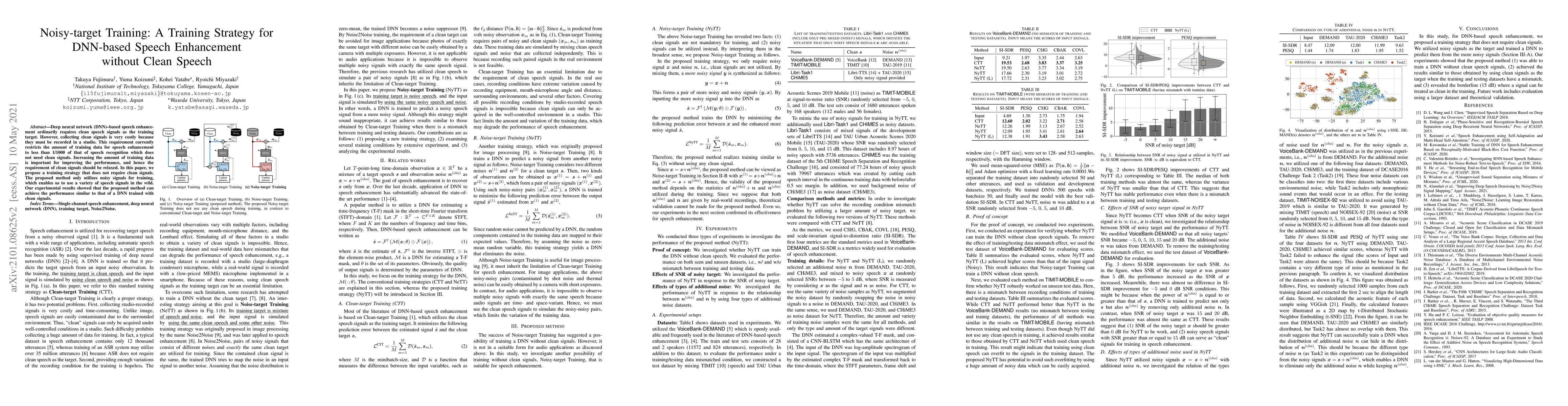 This paper proposes a training strategy for DNN-based speech enhancement that does not require clean speech signals, enabling the use of noisy signals for training. Experimental results indicate that the method achieves performance comparable to DNNs trained with clean signals, thus relaxing the need for costly clean recordings.