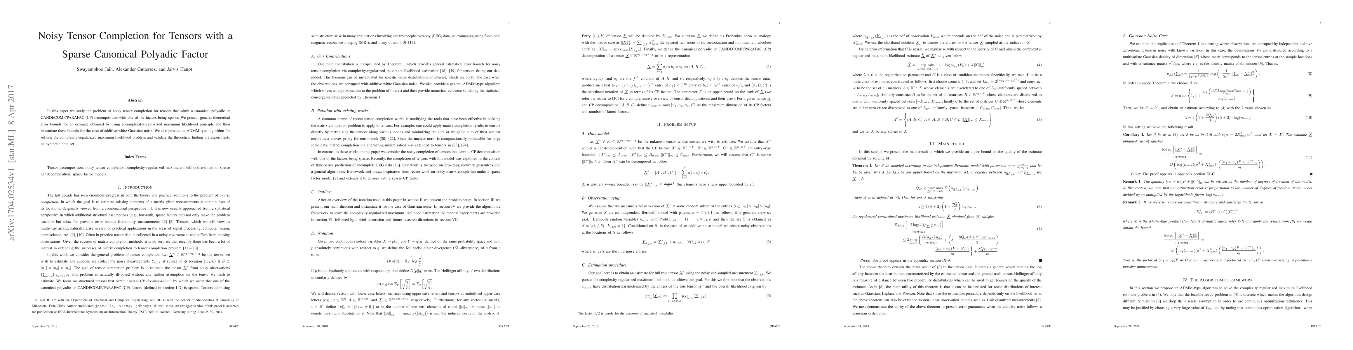 This paper addresses the problem of completing noisy tensors with a sparse canonical polyadic factor, presenting theoretical error bounds for a complexity-regularized maximum likelihood estimate under additive white Gaussian noise. An ADMM-type algorithm is proposed and validated through experiments on synthetic data.