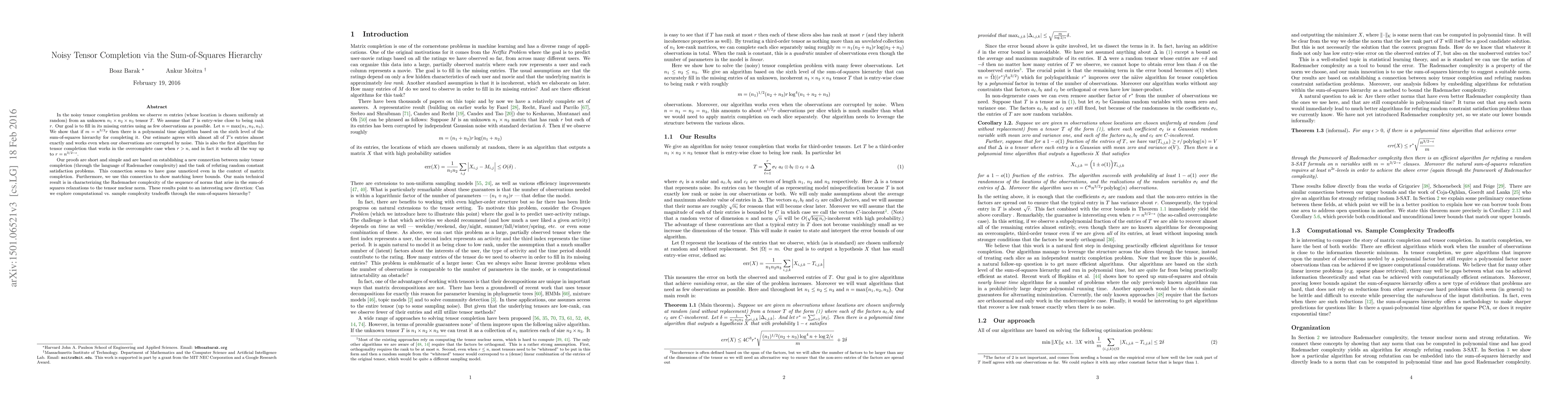 This paper presents a polynomial time algorithm for noisy tensor completion using the sixth level of the sum-of-squares hierarchy, achieving accurate completion even with noisy observations. It establishes a novel connection between tensor completion and refuting random constant satisfaction problems, and provides matching lower bounds, highlighting potential new directions for exploring computational vs. sample complexity tradeoffs.