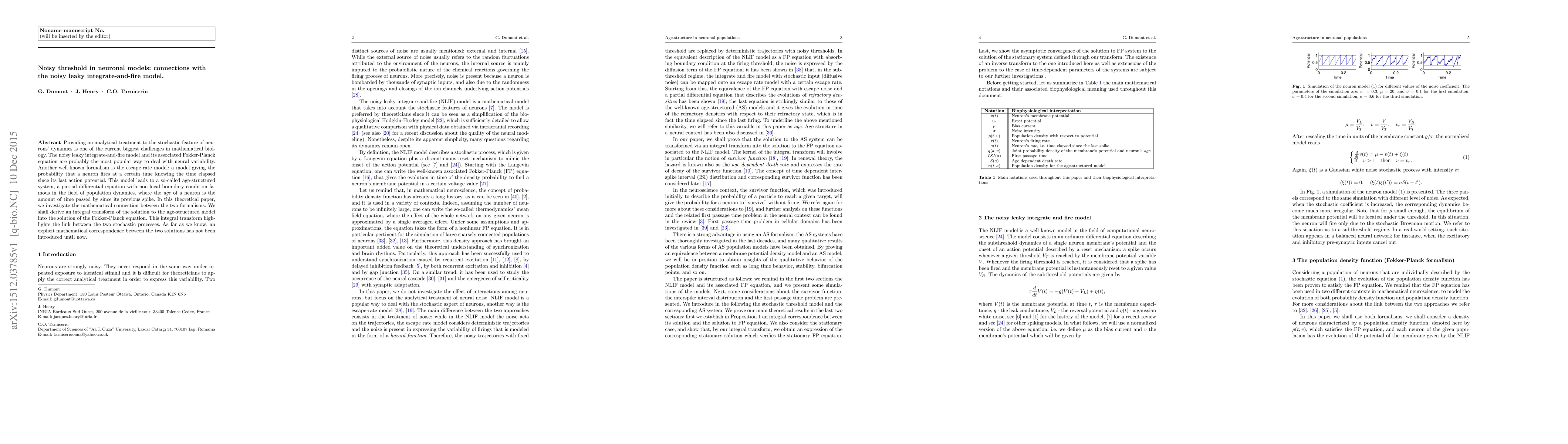 Providing an analytical treatment to the stochastic feature of neurons' dynamics is one of the current biggest challenges in mathematical biology. The noisy leaky integrate-and-fire model and its associated Fokker-Planck equation are probably the most popular way to deal with neural variability. Another well-known formalism is the escape-rate model: a model giving the probability that a neuron fires at a certain time knowing the time elapsed since its last action potential. This model leads to a so-called age-structured system, a partial differential equation with non-local boundary condition famous in the field of population dynamics, where the {\it age} of a neuron is the amount of time passed by since its previous spike. In this theoretical paper, we investigate the mathematical connection between the two formalisms. We shall derive an integral transform of the solution to the age-structured model into the solution of the Fokker-Planck equation. This integral transform highlights the link between the two stochastic processes. As far as we know, an explicit mathematical correspondence between the two solutions has not been introduced until now.