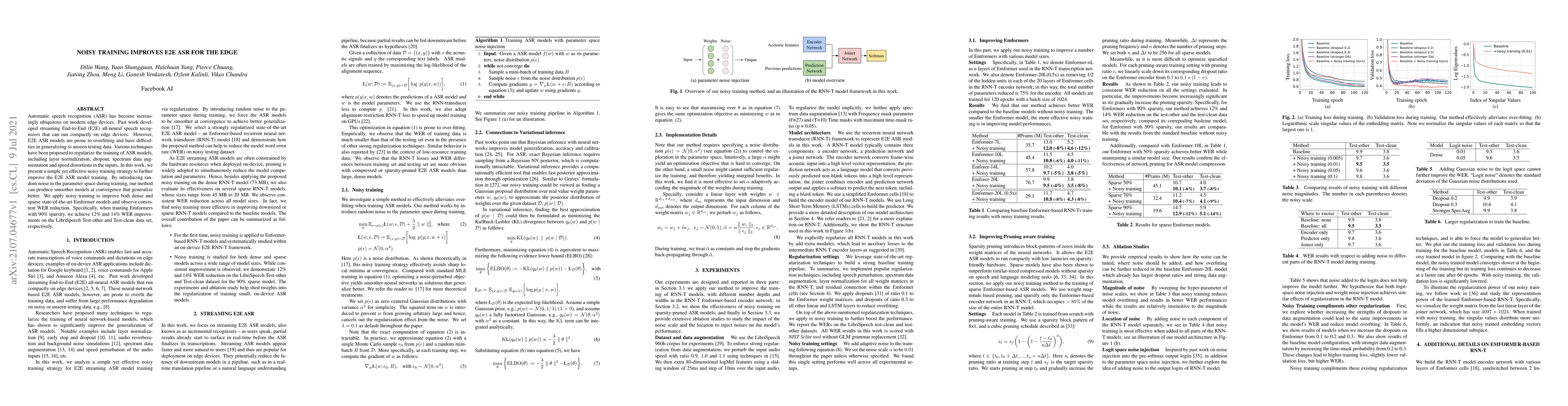 Automatic speech recognition (ASR) has become increasingly ubiquitous on modern edge devices. Past work developed streaming End-to-End (E2E) all-neural speech recognizers that can run compactly on edge devices. However, E2E ASR models are prone to overfitting and have difficulties in generalizing to unseen testing data. Various techniques have been proposed to regularize the training of ASR models, including layer normalization, dropout, spectrum data augmentation and speed distortions in the inputs. In this work, we present a simple yet effective noisy training strategy to further improve the E2E ASR model training. By introducing random noise to the parameter space during training, our method can produce smoother models at convergence that generalize better. We apply noisy training to improve both dense and sparse state-of-the-art Emformer models and observe consistent WER reduction. Specifically, when training Emformers with 90% sparsity, we achieve 12% and 14% WER improvements on the LibriSpeech Test-other and Test-clean data set, respectively.