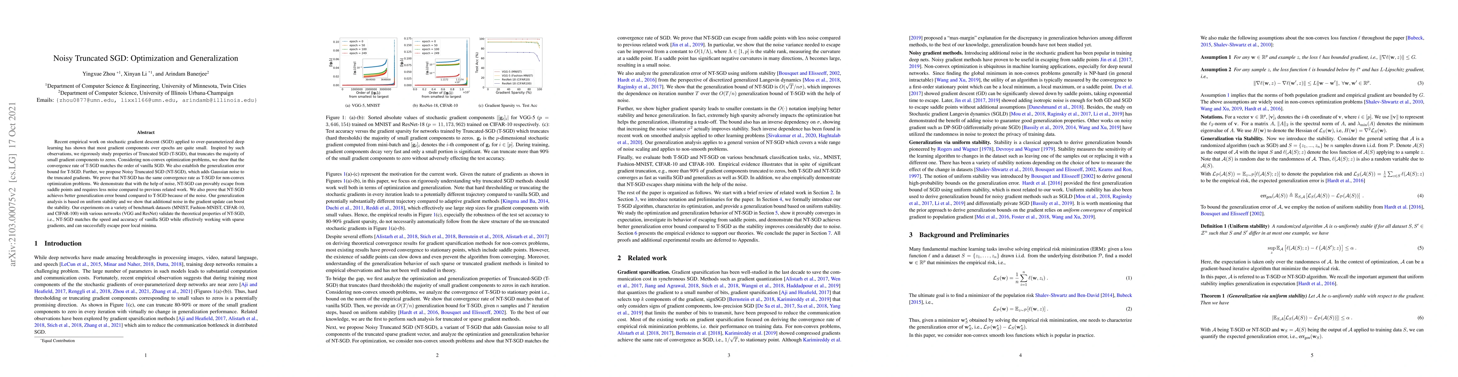 This paper investigates Truncated SGD (T-SGD), which omits small gradient components, and Noisy Truncated SGD (NT-SGD), which adds Gaussian noise to truncated gradients. The authors prove that NT-SGD converges similarly to T-SGD but can better escape saddle points and has a better generalization error bound due to noise, validated through experiments on benchmark datasets.