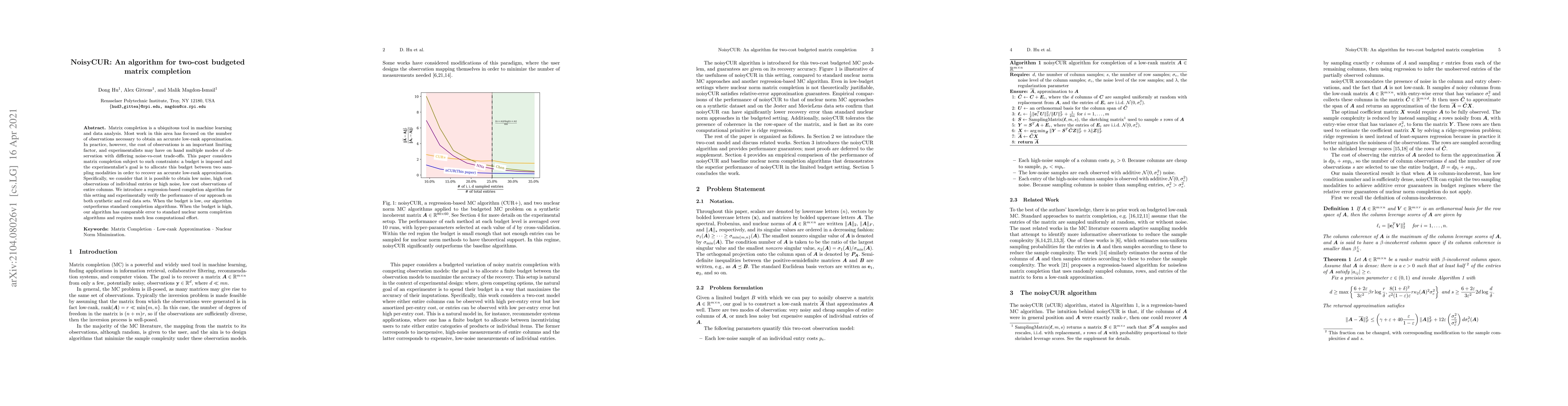 A new algorithm, NoisyCUR, optimizes matrix completion under a budget constraint, outperforming standard methods when budgets are low and requiring less computation when budgets are high.
