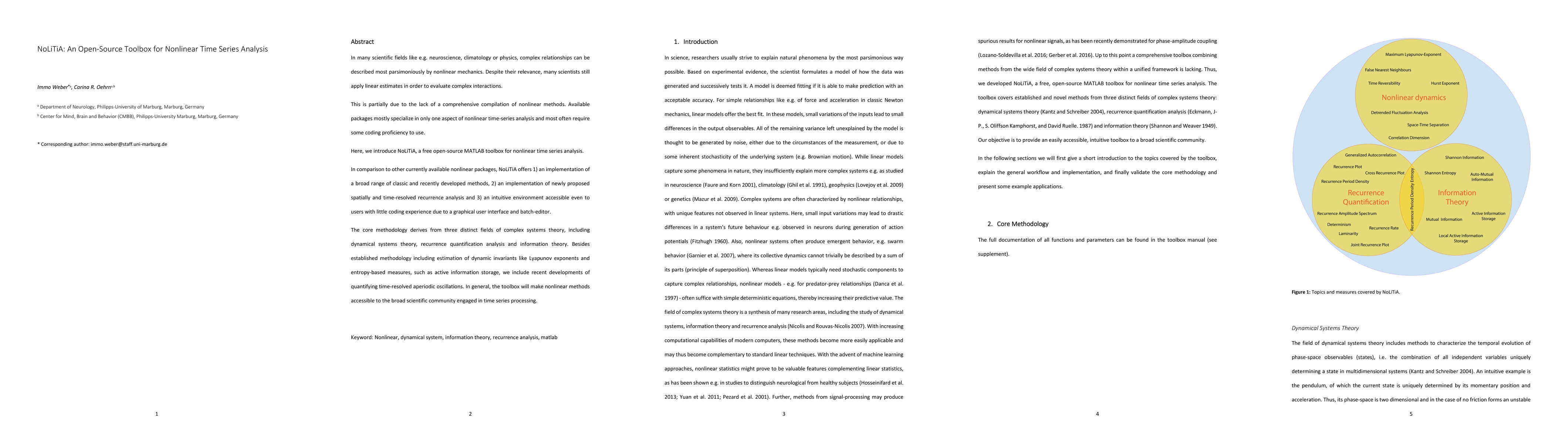 NoLiTiA is an open-source MATLAB toolbox designed to simplify nonlinear time series analysis, offering a wide range of methods and an intuitive interface for users with minimal coding experience. It aims to make advanced nonlinear analysis accessible to scientists across various fields.