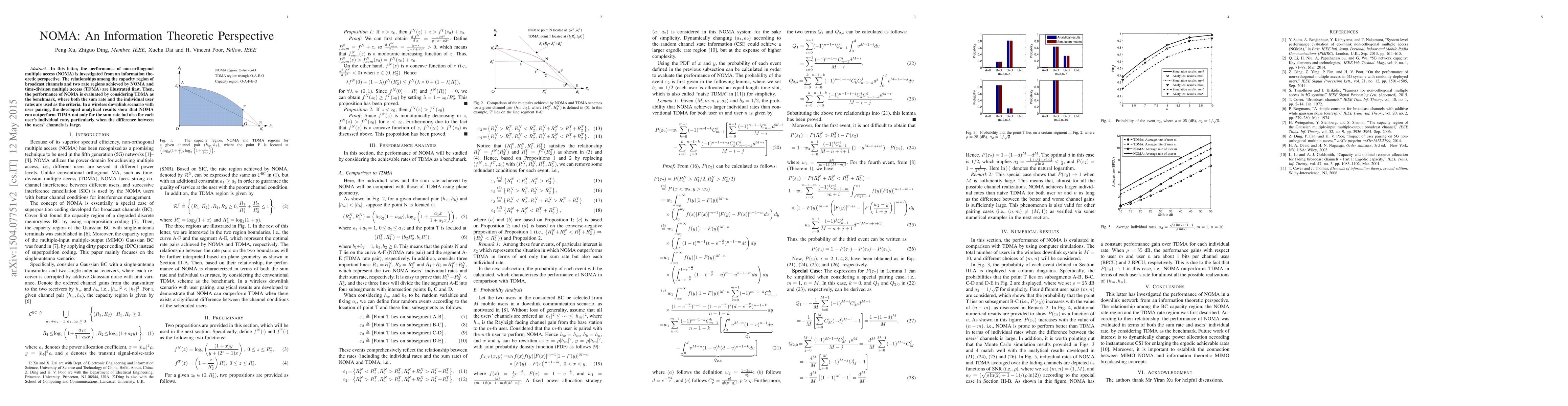 The paper investigates NOMA from an information-theoretic perspective, analyzing its performance in a wireless downlink scenario with user pairing, benchmarked against TDMA using capacity regions and rate comparisons.