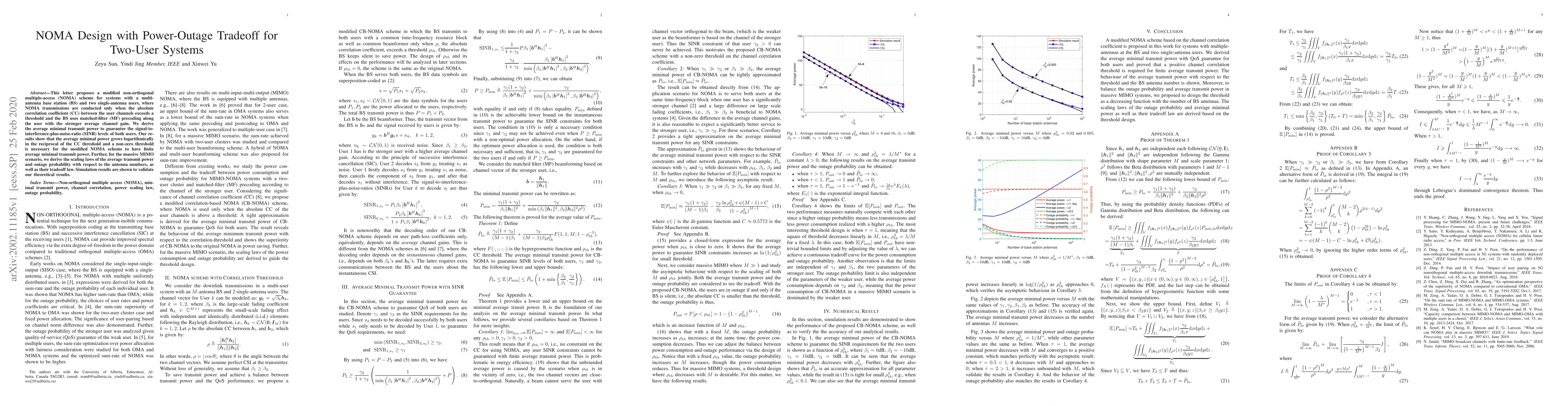 This letter proposes a modified non-orthogonal multiple-access (NOMA) scheme for systems with a multi-antenna base station (BS) and two single-antenna users, where NOMA transmissions are conducted only when the absolute correlation coefficient (CC) between the user channels exceeds a threshold and the BS uses matched-filter (MF) precoding along the user with the stronger average channel gain. We derive the average minimal transmit power to guarantee the signal-to-interference-plus-noise-ratio (SINR) levels of both users. Our results show that the average minimal power grows logarithmically in the reciprocal of the CC threshold and a non-zero threshold is necessary for the modified NOMA scheme to have finite average minimal transmit power. Further, for the massive MIMO scenario, we derive the scaling laws of the average transmit power and outage probability with respect to the antenna numbers, as well as their tradeoff law. Simulation results are shown to validate our theoretical results.