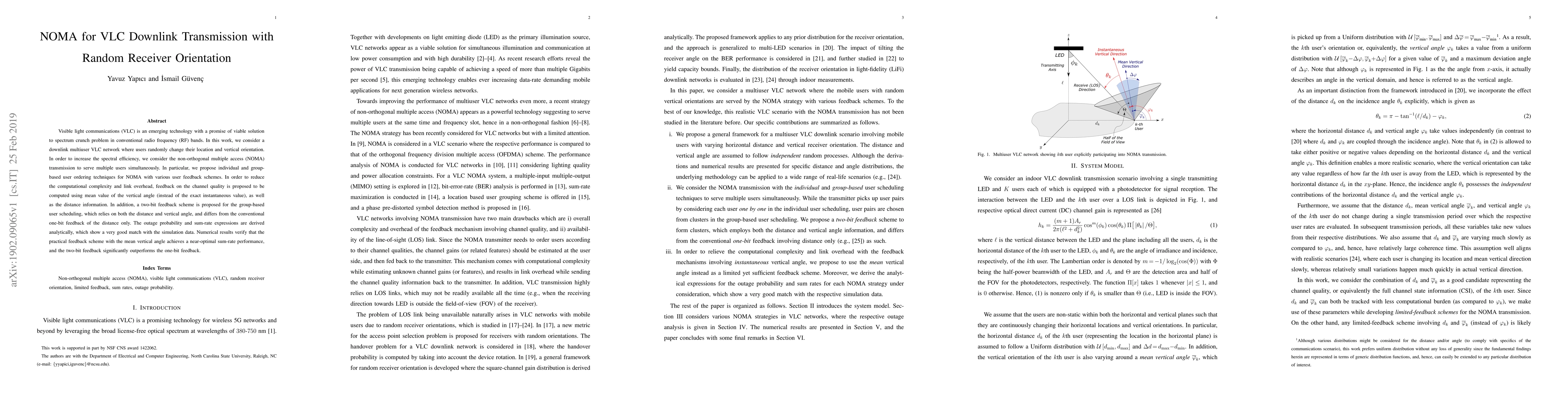This paper proposes NOMA for downlink VLC transmissions in a multiuser network with randomly changing receiver orientations, introducing individual and group-based user ordering techniques. The study optimizes spectral efficiency through practical feedback mechanisms, including a two-bit scheme for group scheduling, and analytically derives outage probability and sum-rate expressions, showing near-optimal performance.
