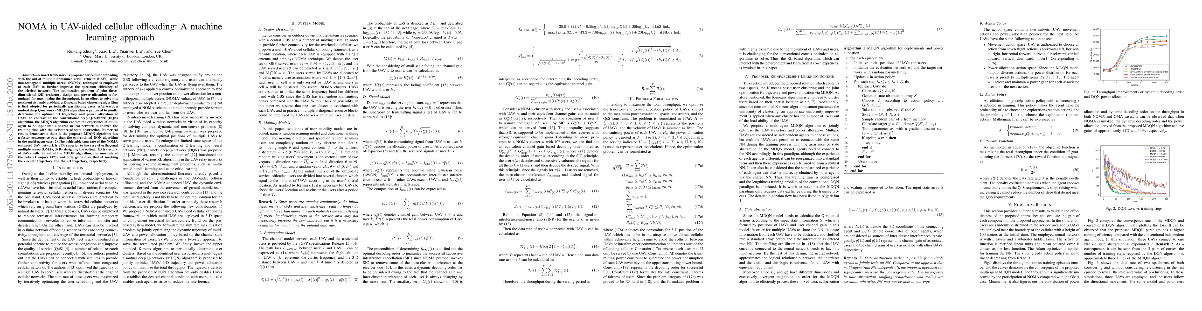 This paper proposes a framework for cellular offloading using UAVs with NOMA, optimizing 3D trajectory and power allocation via a K-means clustering and MDQN algorithm. The MDQN algorithm shows faster convergence and achieves a 23% higher sum rate compared to OMA, with significant gains from optimal 3D UAV trajectory design.