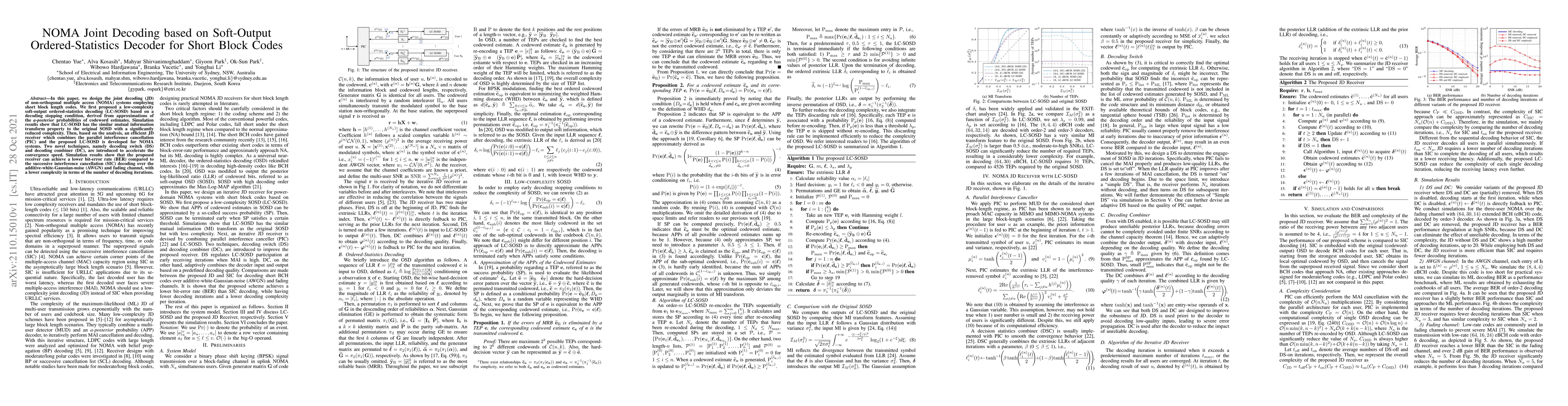 This paper proposes a low-complexity joint decoding method for NOMA systems using short block codes, introducing a soft-output ordered-statistics decoder with reduced complexity. The developed receiver combines parallel interference cancellation and the proposed decoder, achieving lower bit-error rates compared to successive interference cancellation, while maintaining lower complexity.
