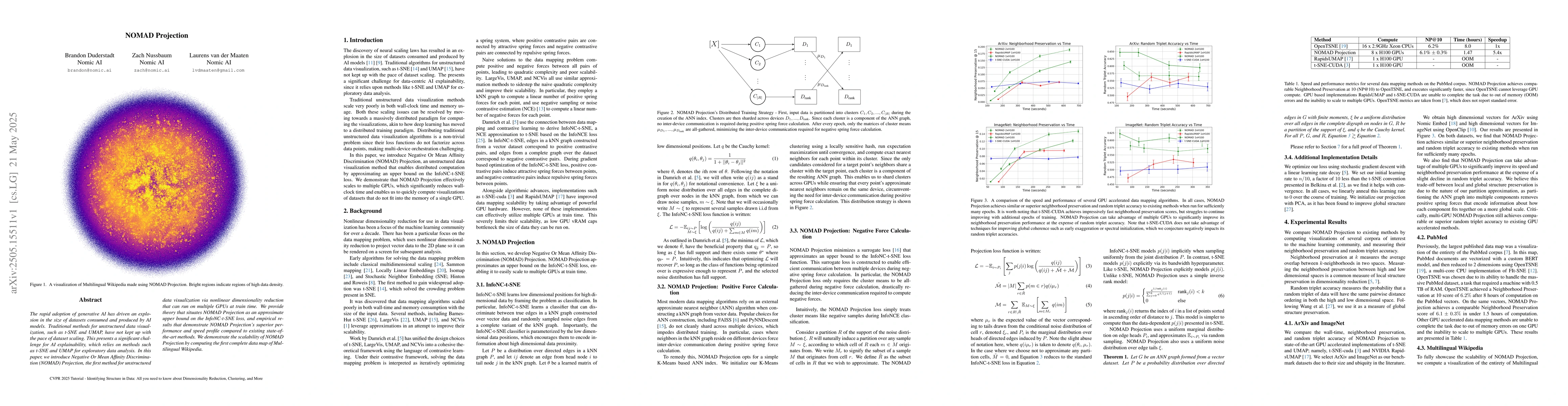 The rapid adoption of generative AI has driven an explosion in the size of datasets consumed and produced by AI models. Traditional methods for unstructured data visualization, such as t-SNE and UMAP, have not kept up with the pace of dataset scaling. This presents a significant challenge for AI explainability, which relies on methods such as t-SNE and UMAP for exploratory data analysis. In this paper, we introduce Negative Or Mean Affinity Discrimination (NOMAD) Projection, the first method for unstructured data visualization via nonlinear dimensionality reduction that can run on multiple GPUs at train time. We provide theory that situates NOMAD Projection as an approximate upper bound on the InfoNC-t-SNE loss, and empirical results that demonstrate NOMAD Projection's superior performance and speed profile compared to existing state-of-the-art methods. We demonstrate the scalability of NOMAD Projection by computing the first complete data map of Multilingual Wikipedia.