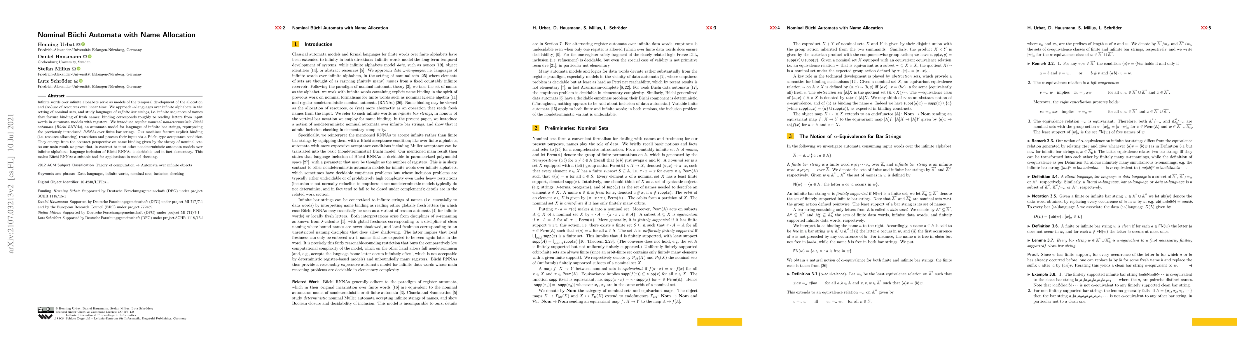 This paper introduces regular nominal nondeterministic Büchi automata (Büchi RNNAs) for processing infinite bar strings representing resource allocation over time. The authors prove that language inclusion for Büchi RNNAs is decidable, making them a useful tool for model checking applications.
