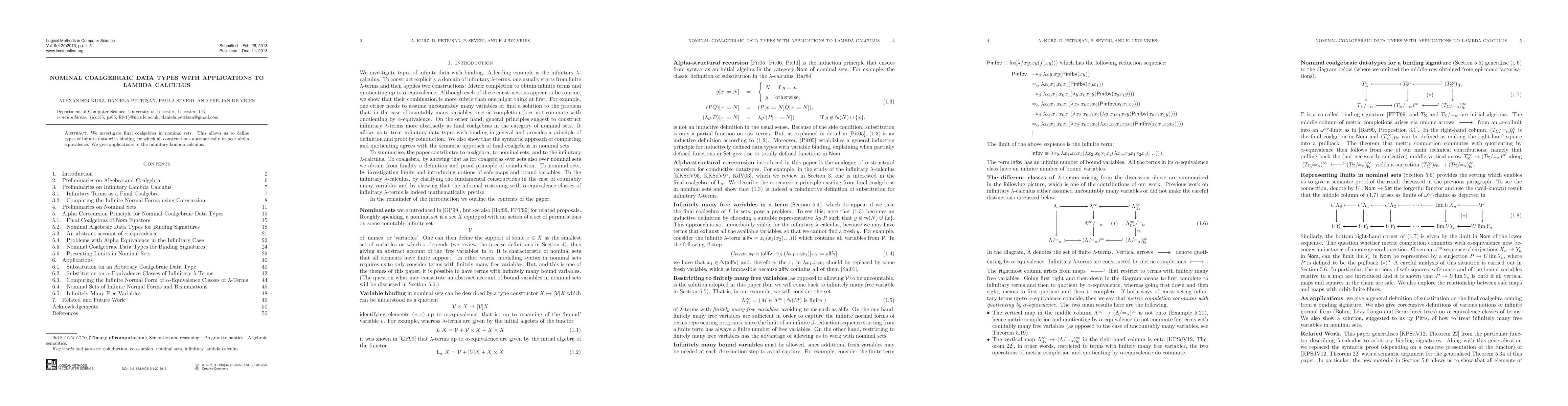 This paper explores final coalgebras in nominal sets to define infinite data types with binding that inherently respect alpha equivalence, and applies these concepts to the development of an infinitary lambda calculus.