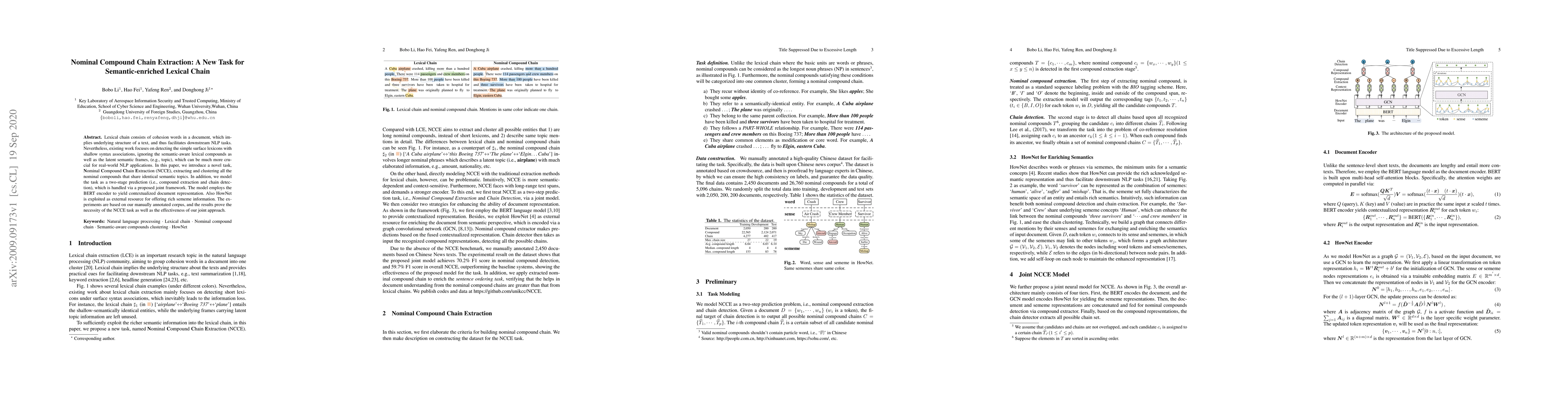 This paper introduces Nominal Compound Chain Extraction (NCCE), a new task focused on extracting and clustering nominal compounds sharing identical semantic topics. The proposed joint framework uses BERT for contextualized representation and HowNet for rich sememe information, demonstrating improved performance over existing methods.
