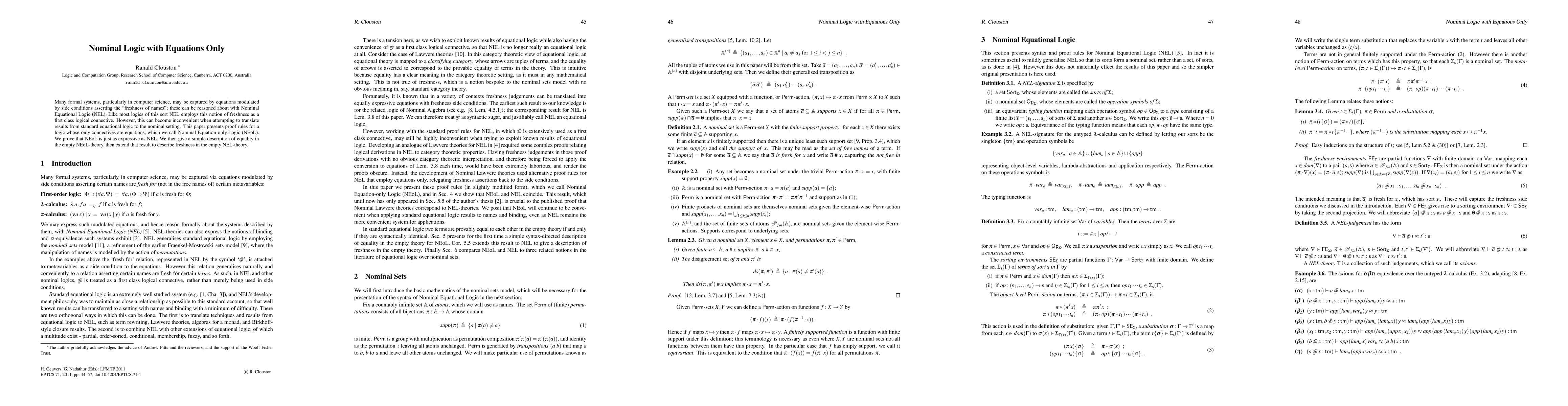 This paper introduces Nominal Equation-only Logic (NEoL), a new logic that uses only equations without the need for a first-class freshness connective, making it more straightforward than Nominal Equational Logic (NEL). The authors prove NEoL's equivalence in expressive power to NEL and describe how to handle equality and freshness in the empty theories of both logics.